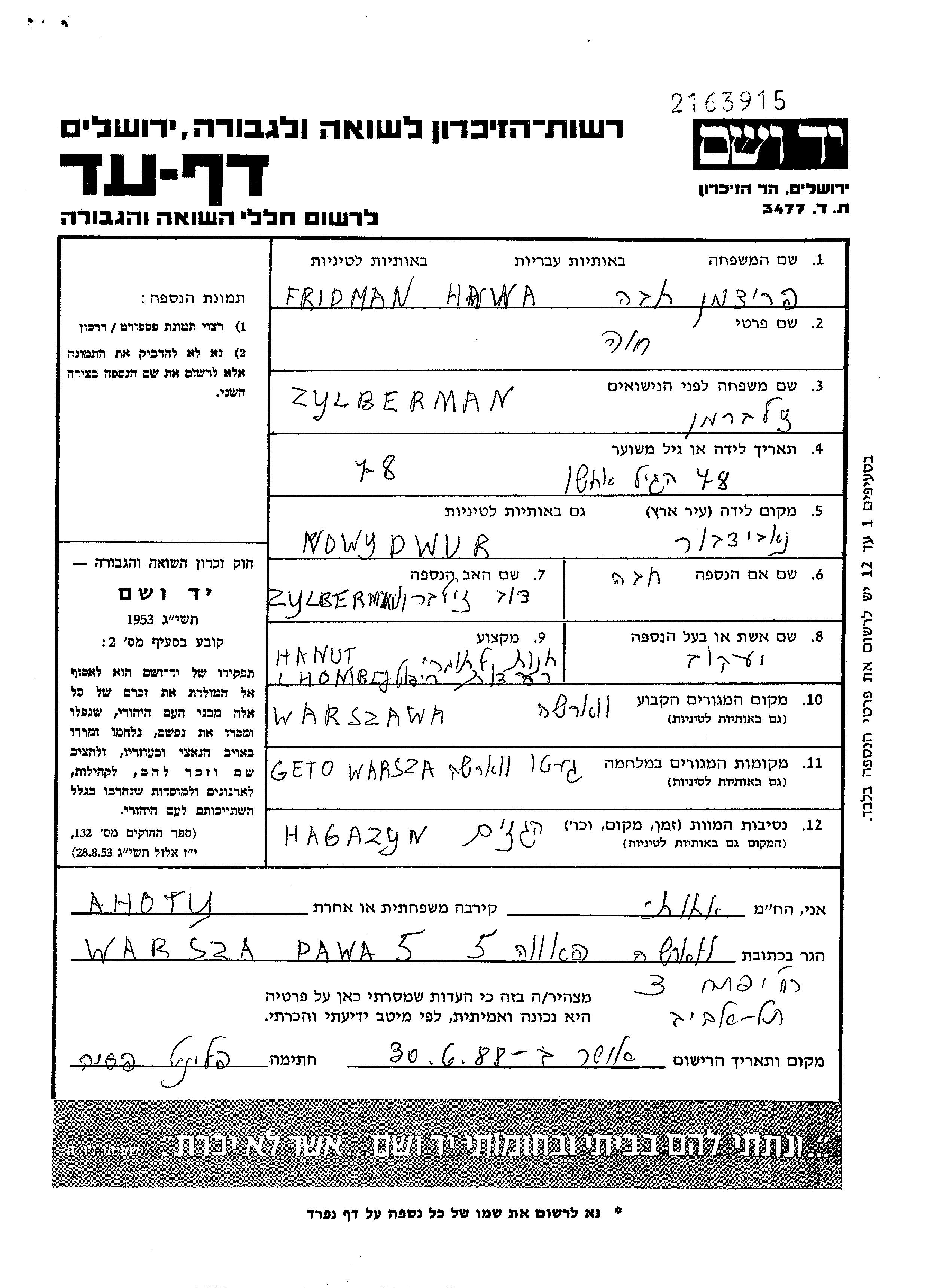 | Fridman | Hawa | Warszawa, Pologne | Feuille de témoignage |