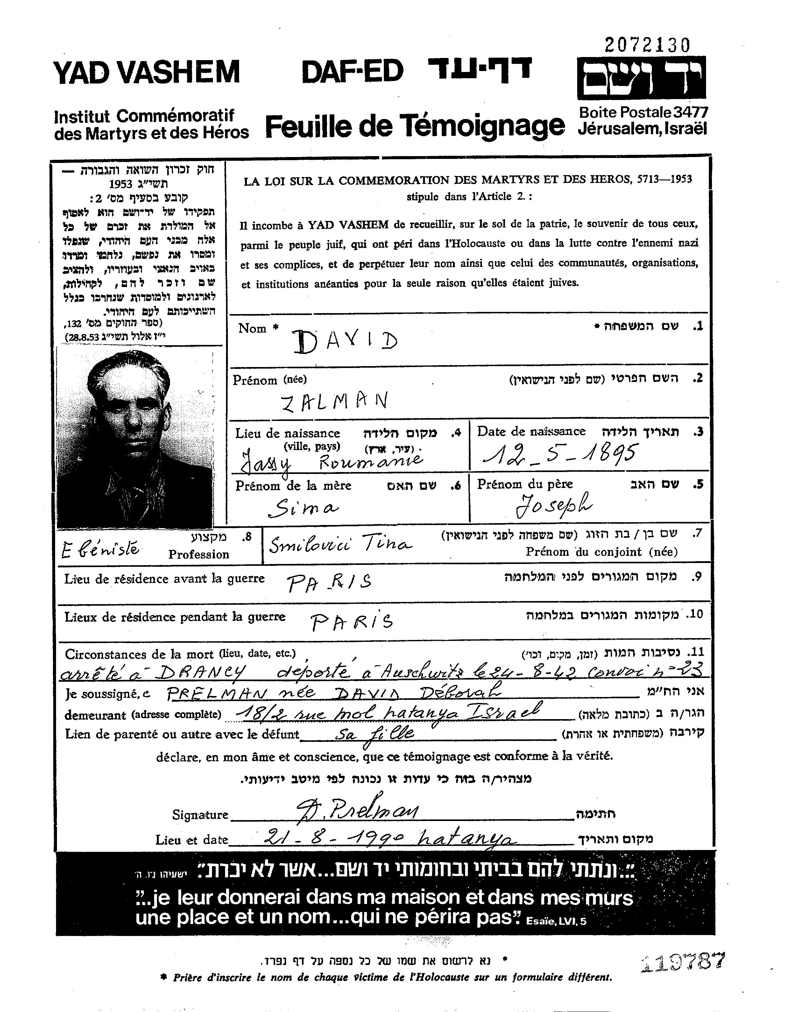 Zalman David est né en 1895. Avant la seconde guerre mondiale il vivait à Paris, France.