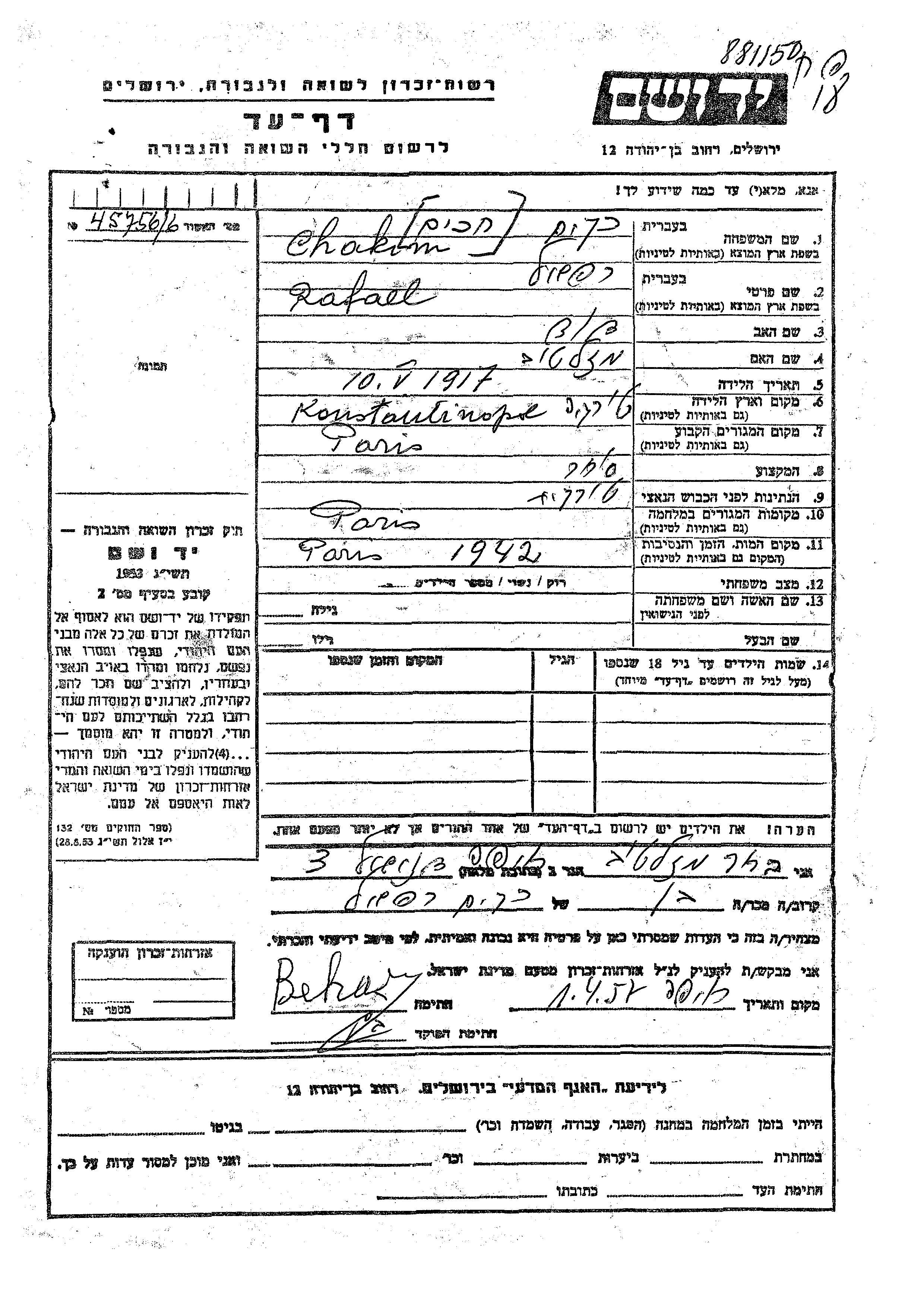 Chakim | Rafael | 1917 | Paris, France | Feuille de témoignage |