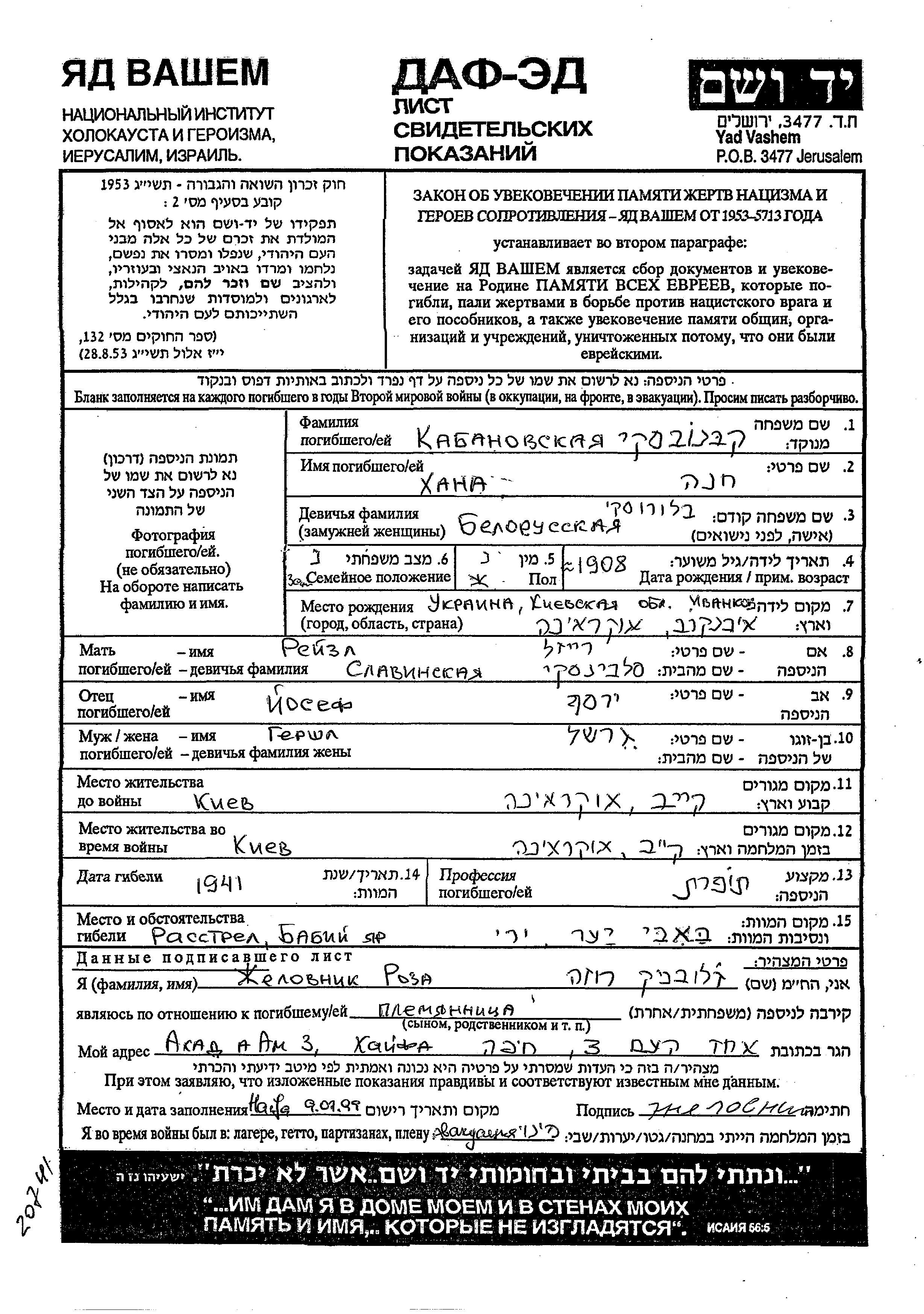 Khana Kabanovski née Beloruski est née à Ivankov, Ukraine (URSS) en 1908. Elle était Couturière. Avant la seconde guerre mondiale elle vivait à Kiyev, Ukraine (URSS). Khana a été assassinée pendant la Shoah. Lieu de la mort: Babi Yar, Ukraine (URSS) en 1941.
