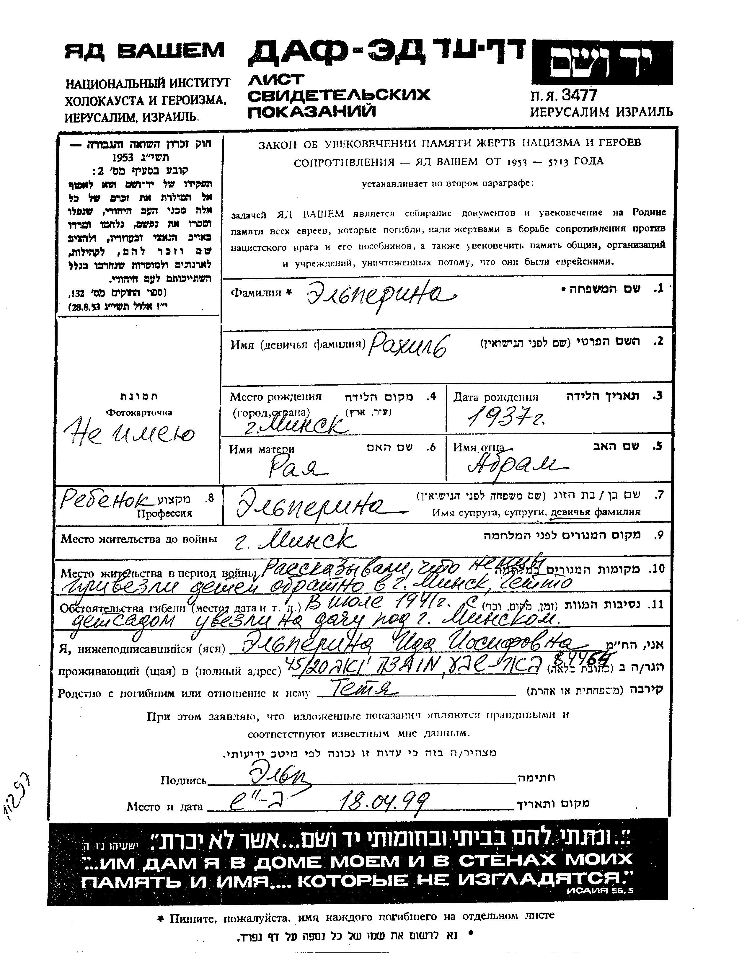 Elperin Rakhil 1937 Minsk, Bélorussie (URSS) Feuille de témoignage