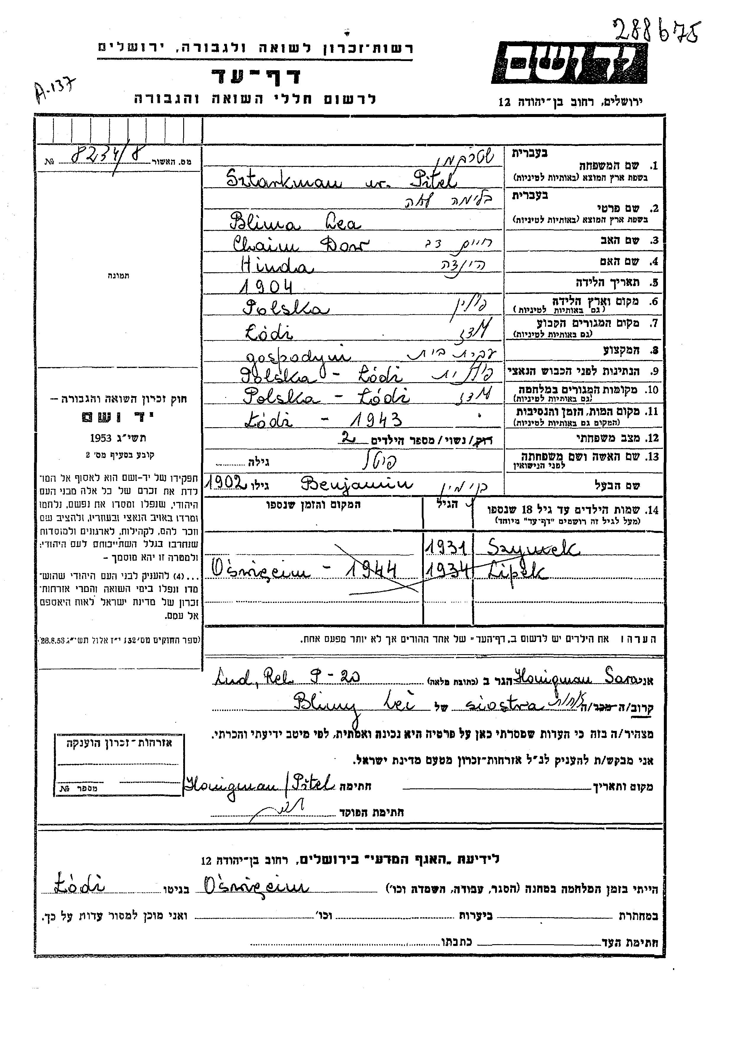 Sztarkman | Szymek | 1931 | Lodz, Pologne | Feuille de témoignage |
