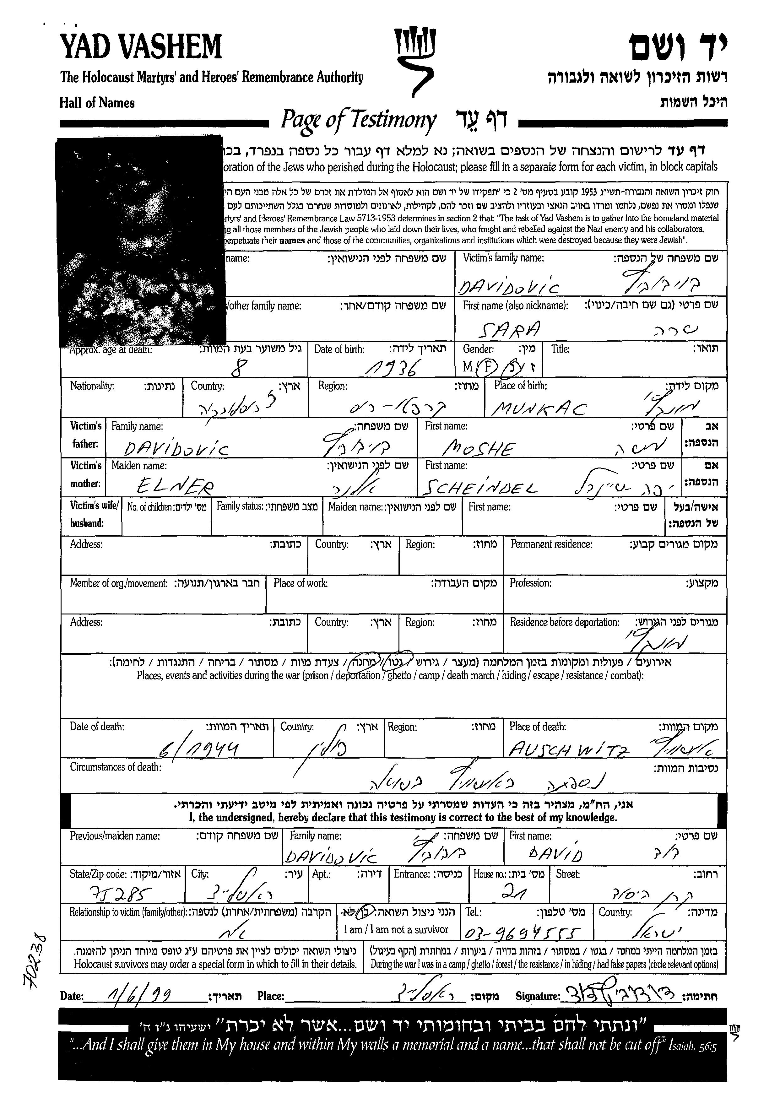Davidovic Sara 1936 Munkac, Tchécoslovaquie Feuille de témoignage