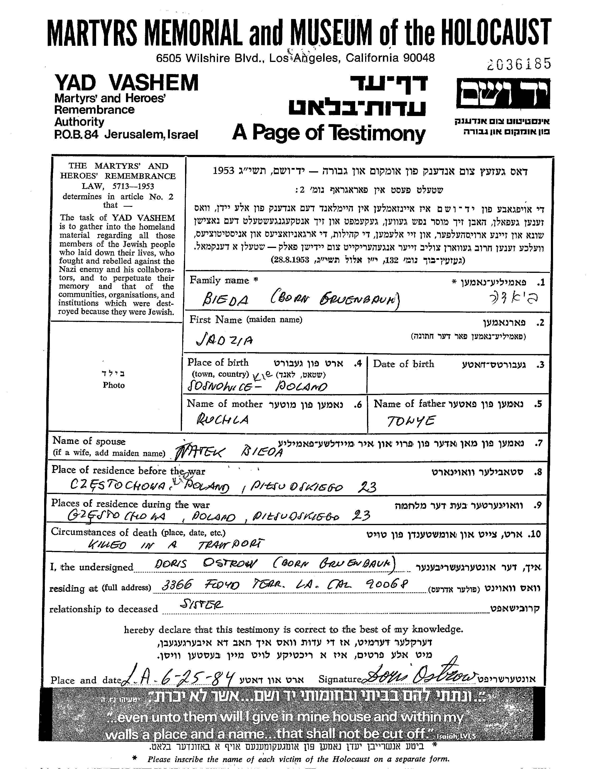 Jadzia Bieda née Gruenbaum est née à Sosnowiec, Pologne. Avant la seconde guerre mondiale elle vivait à Czestochowa, Pologne.