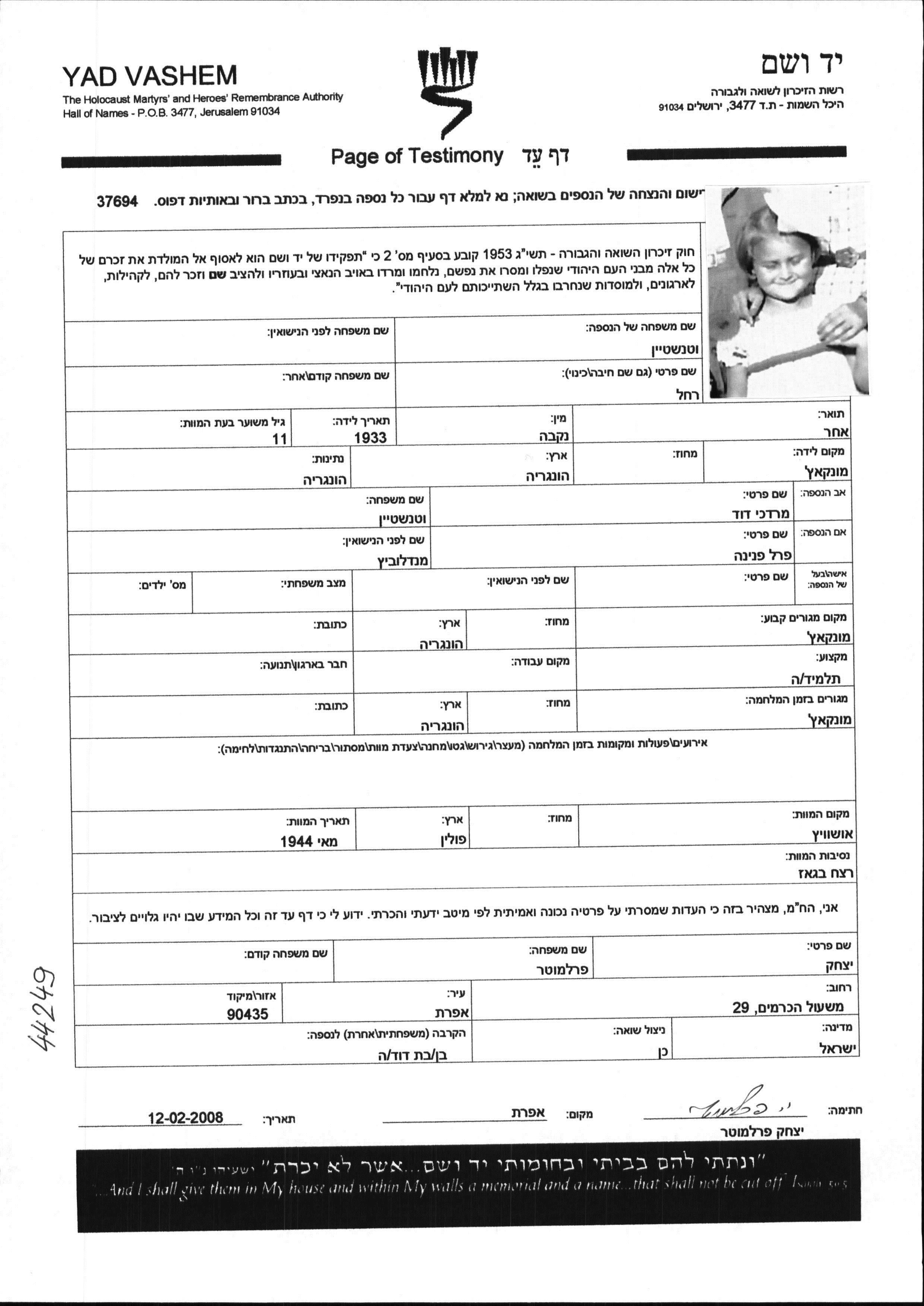 Vetenshtein Rakhel 1933 Munkacs, Tchécoslovaquie Feuille de témoignage (digitale-signée)