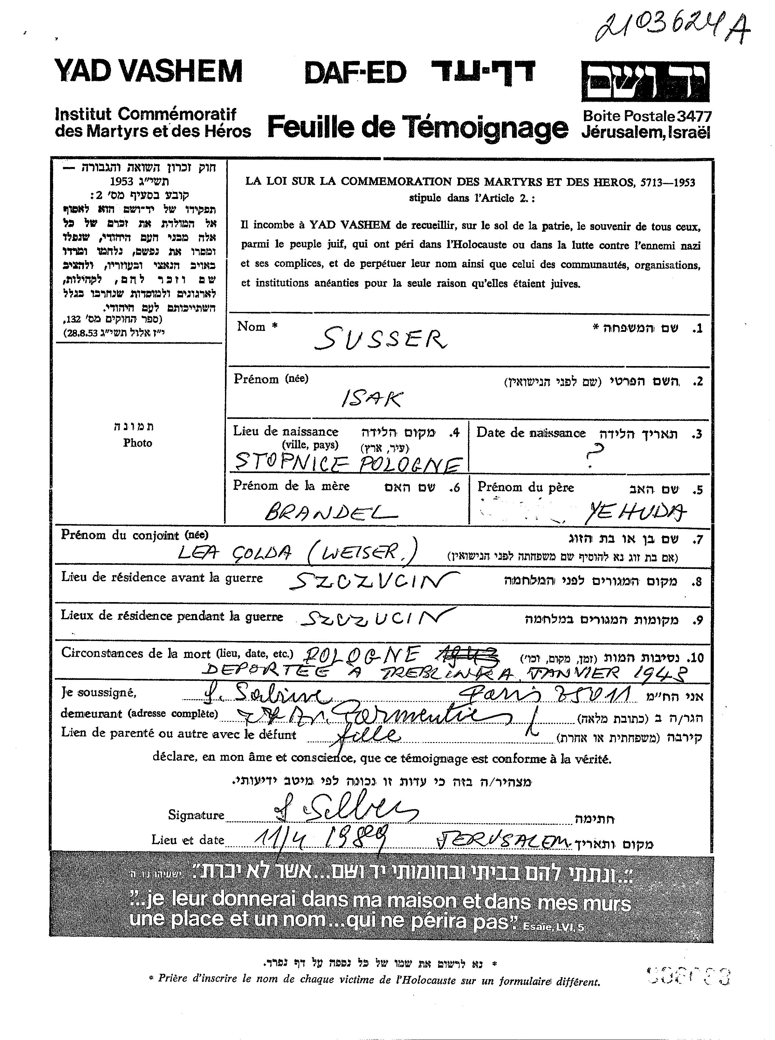 Susser Zuser Isak Szczucin, Pologne Feuille de témoignage