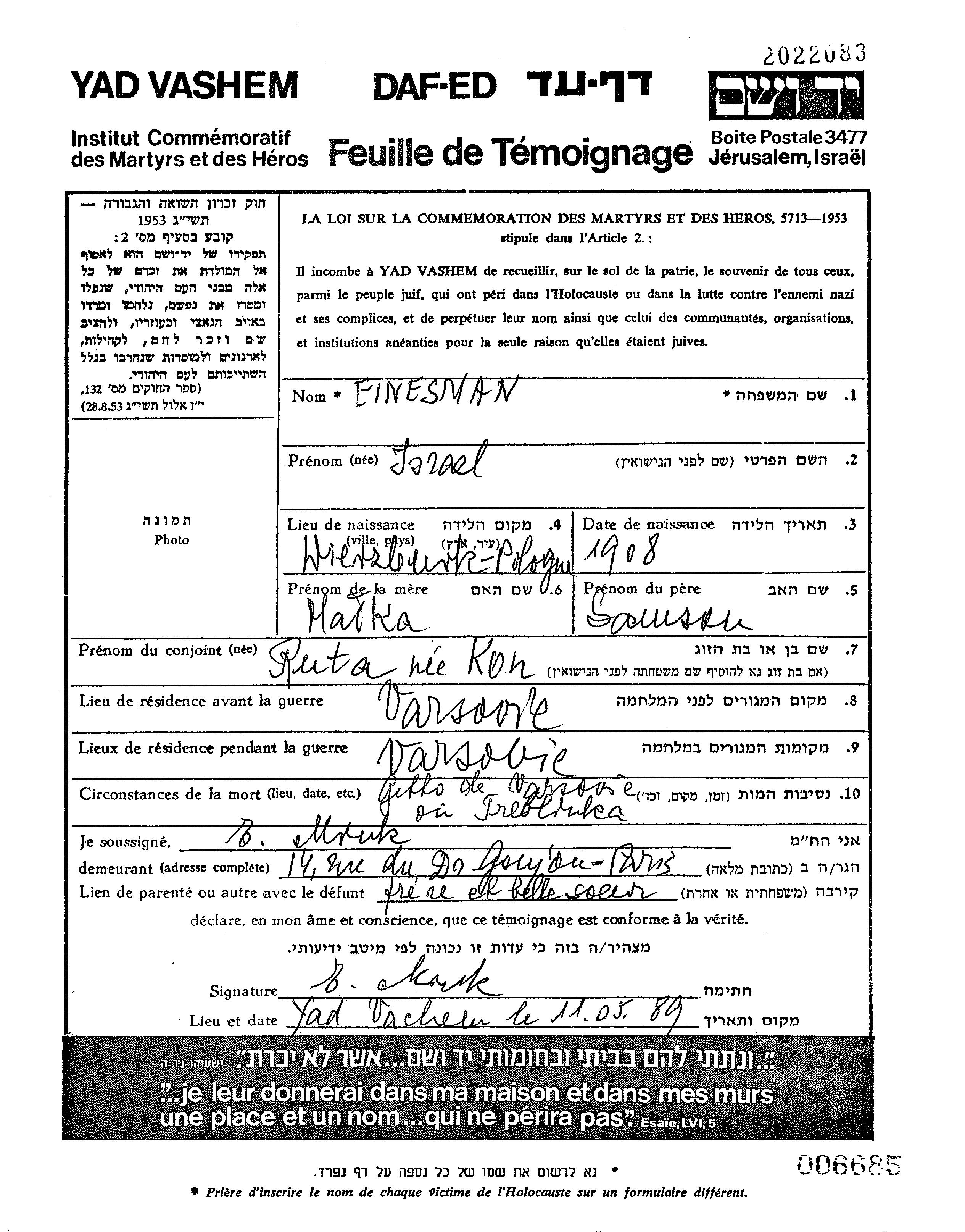 Ejnesman Israel Warsaw, Pologne Feuille de témoignage