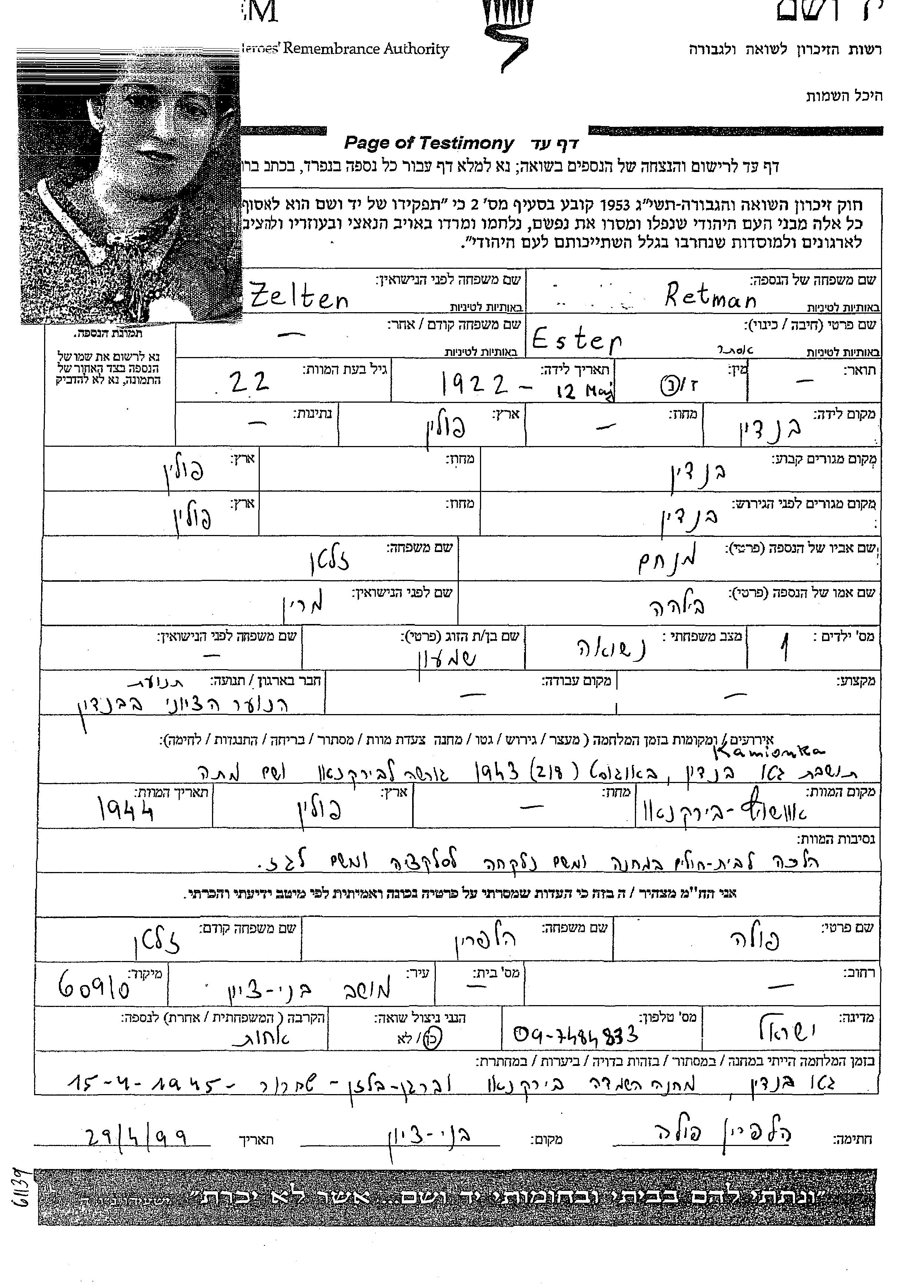 Ester Retman née Zelten est née à Bendin, Pologne en 1922. Elle était Couturière. Avant la seconde guerre mondiale elle vivait à Bendin, Pologne.
