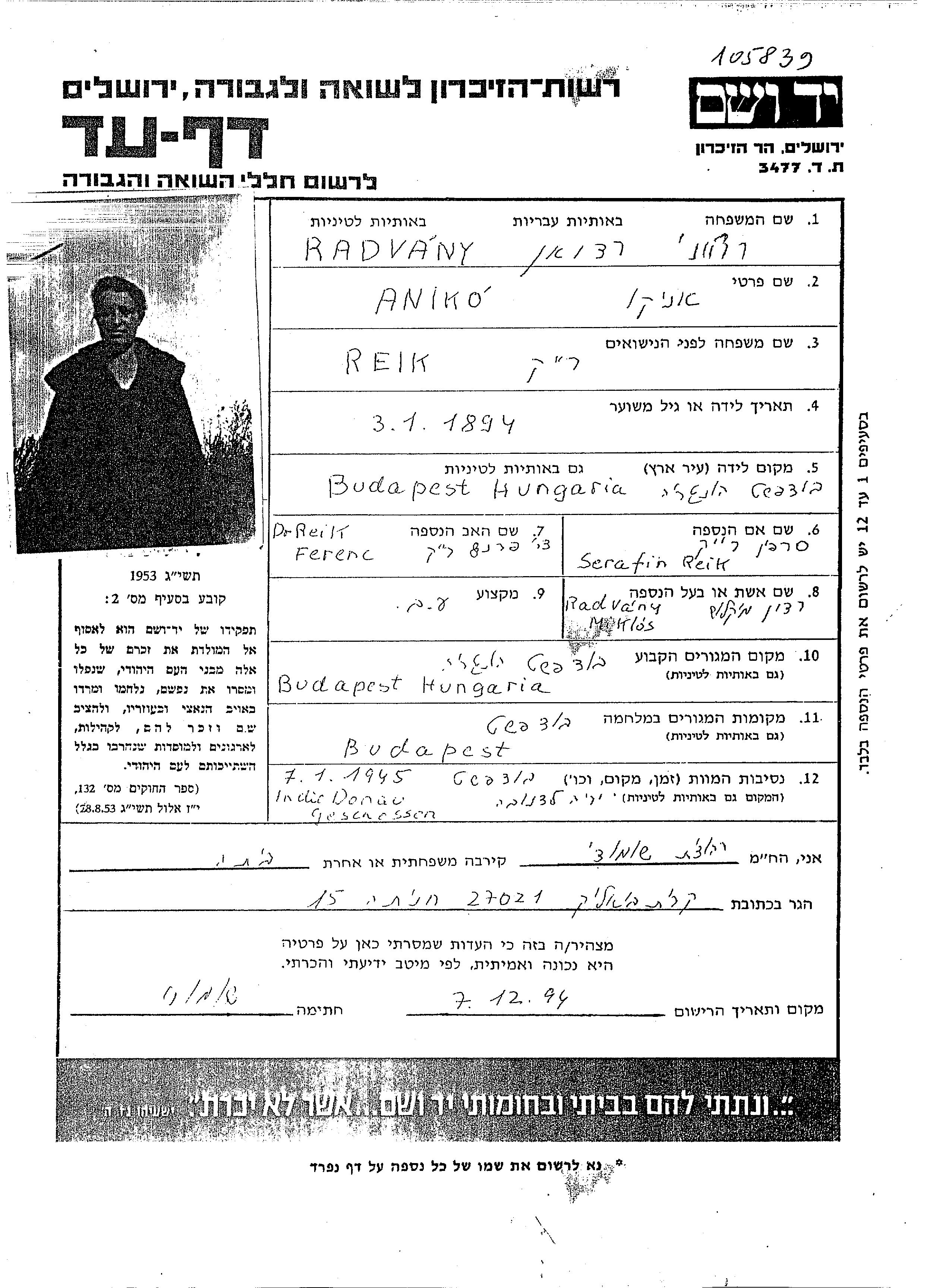 Radvany Reik Aniko Budapest, Hongrie Feuille de témoignage