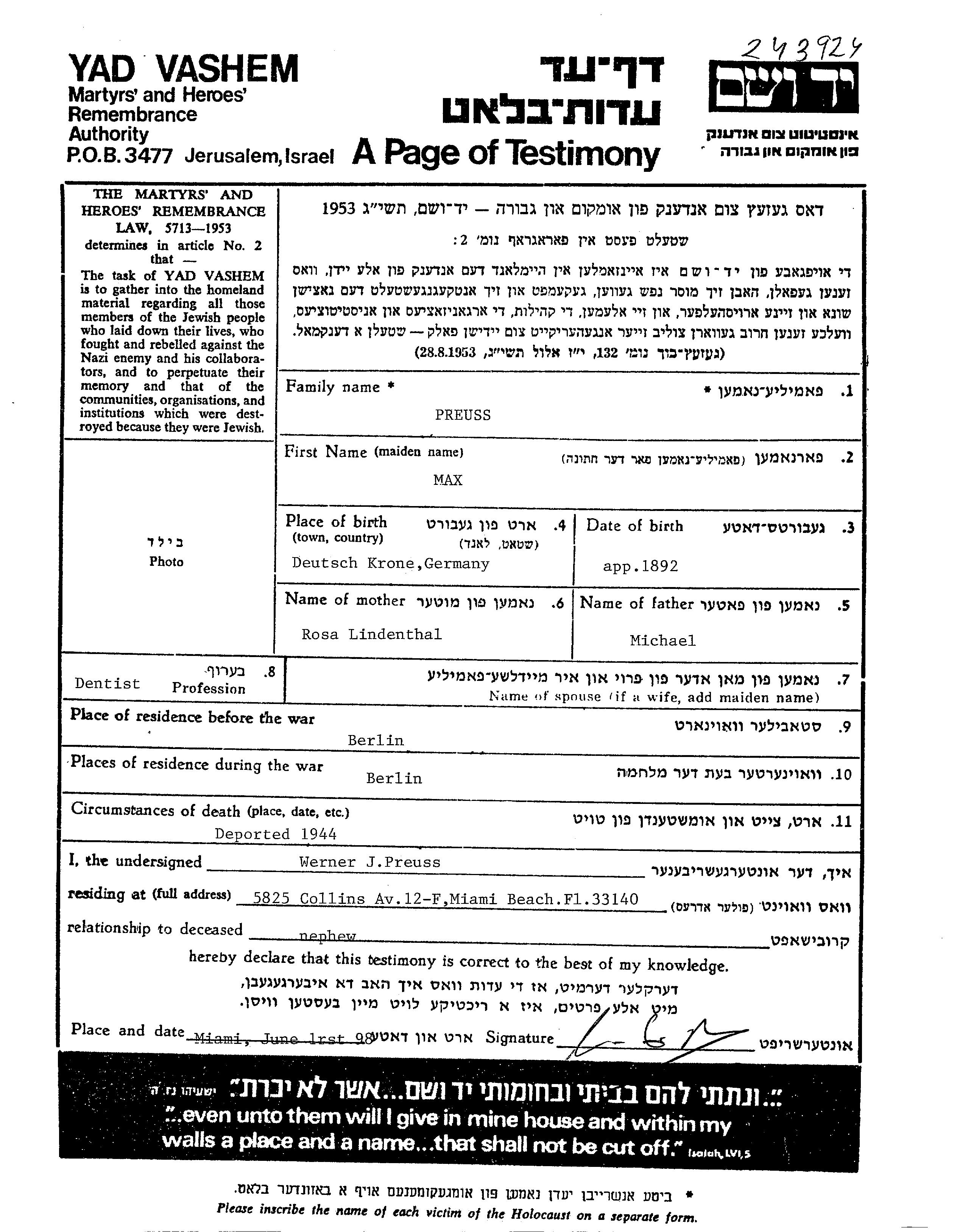 Max Preuss est né à Deutsch Krone, Allemagne en 1892. Il était Dentiste. Avant la seconde guerre mondiale il vivait à Berlin, Allemagne.