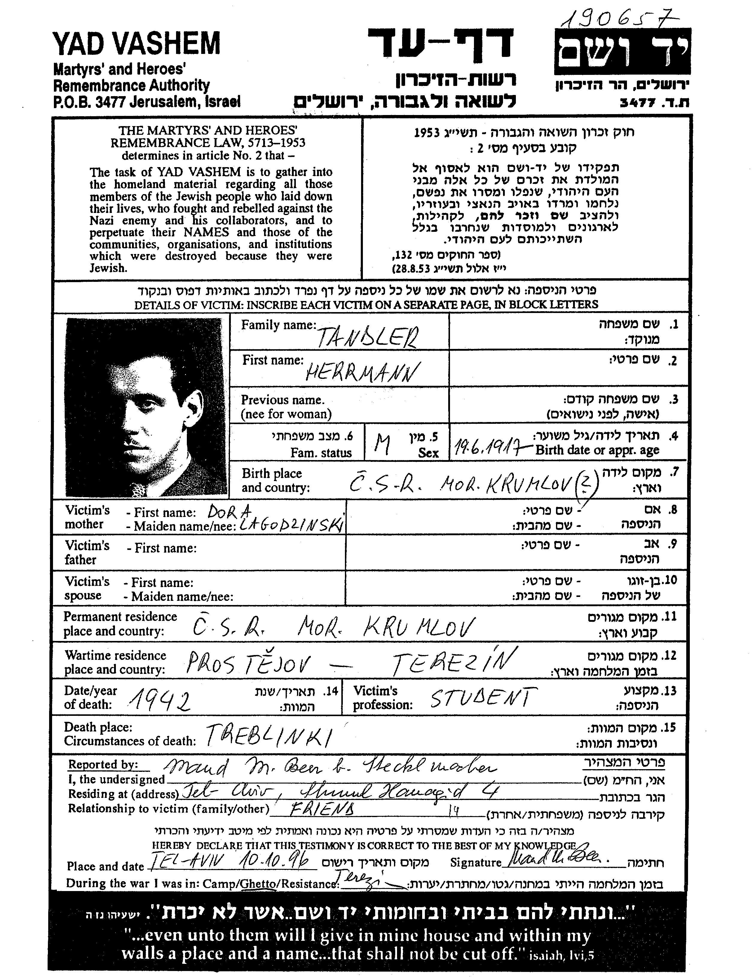 Tandler Herman 1917 Moravsky Krumlov, Tchécoslovaquie Feuille de témoignage