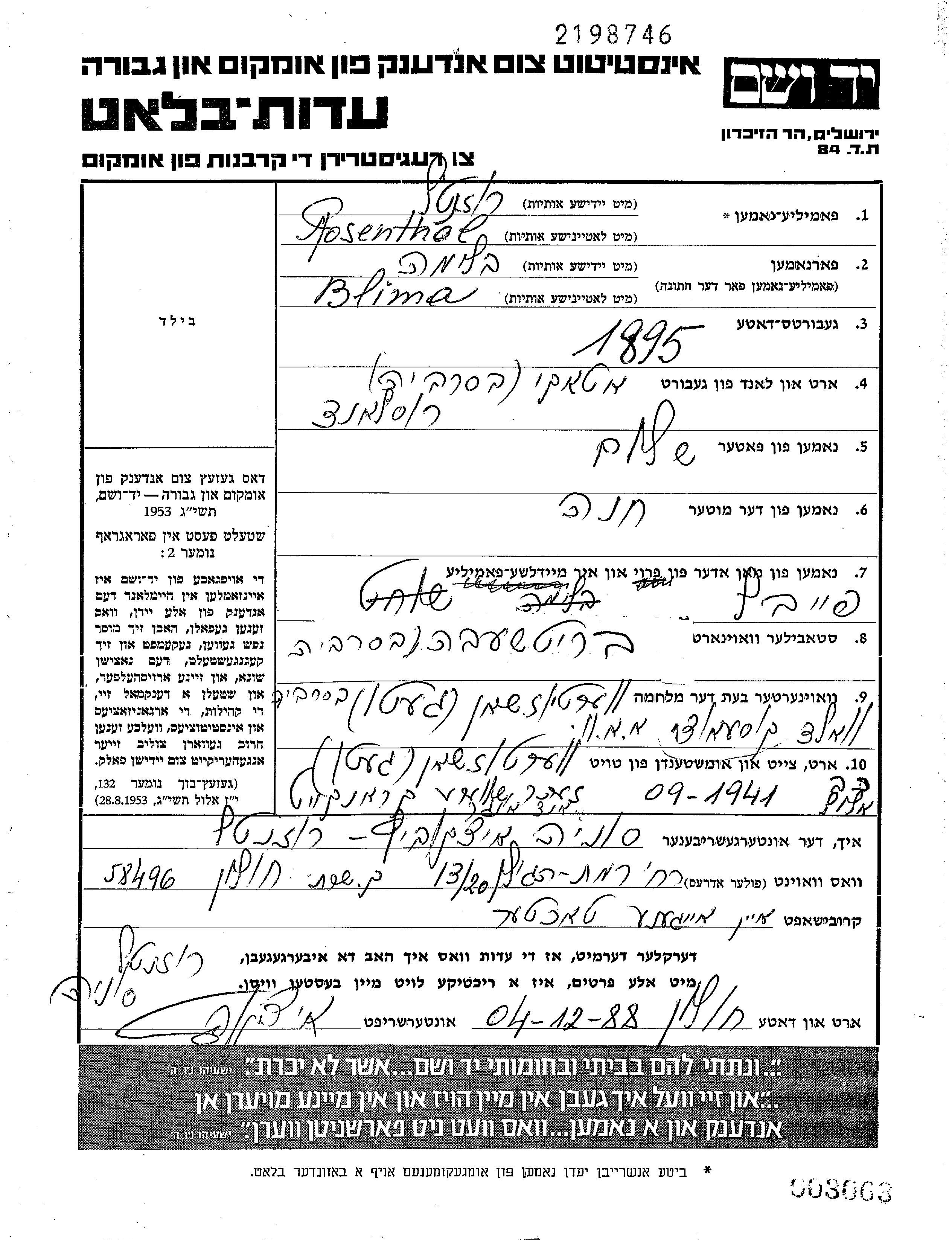 Rosenthal Blima 1895 Briceva, Roumanie Feuille de témoignage