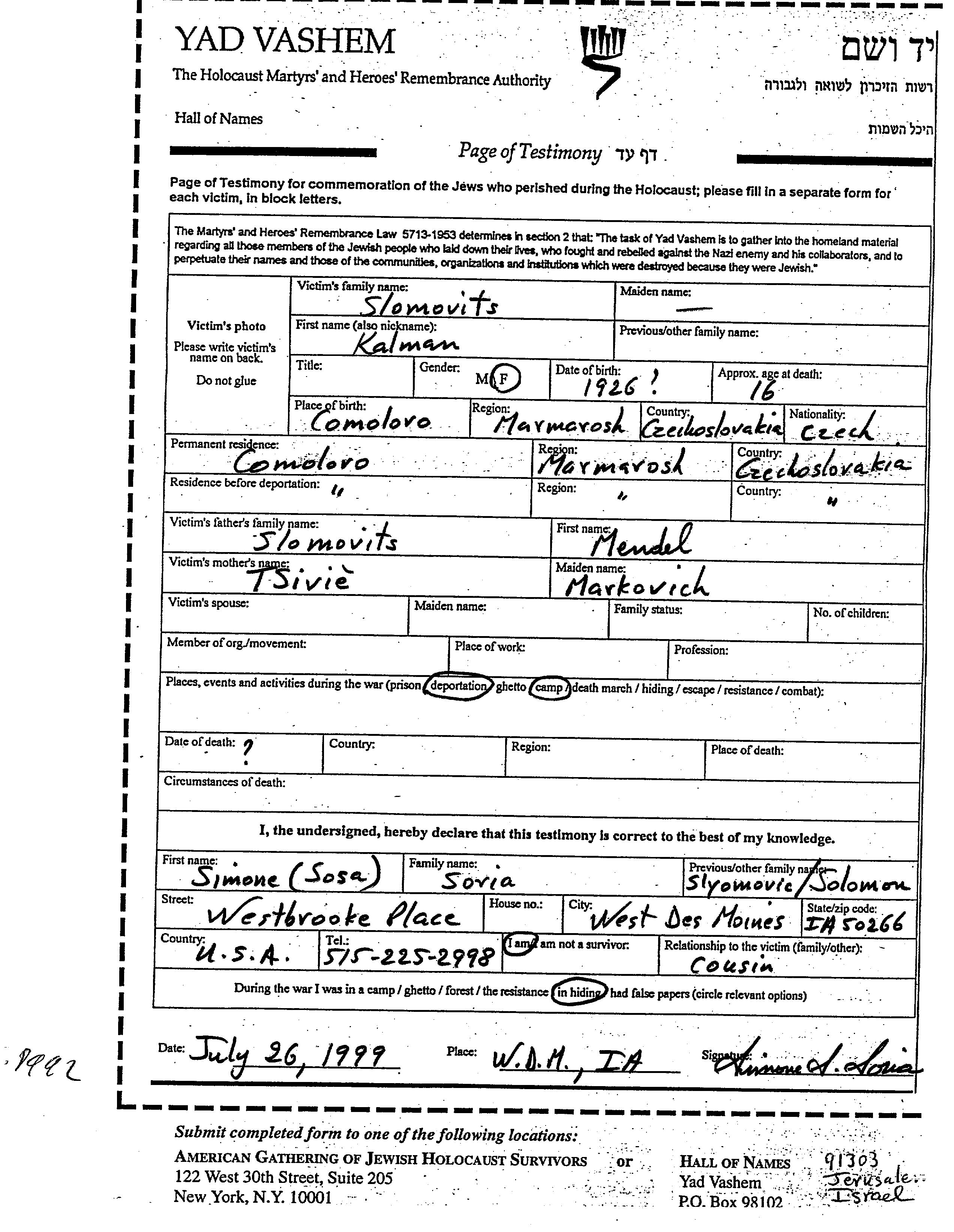 Slomovits Kalman 1926 Comalovo, Tchécoslovaquie Feuille de témoignage