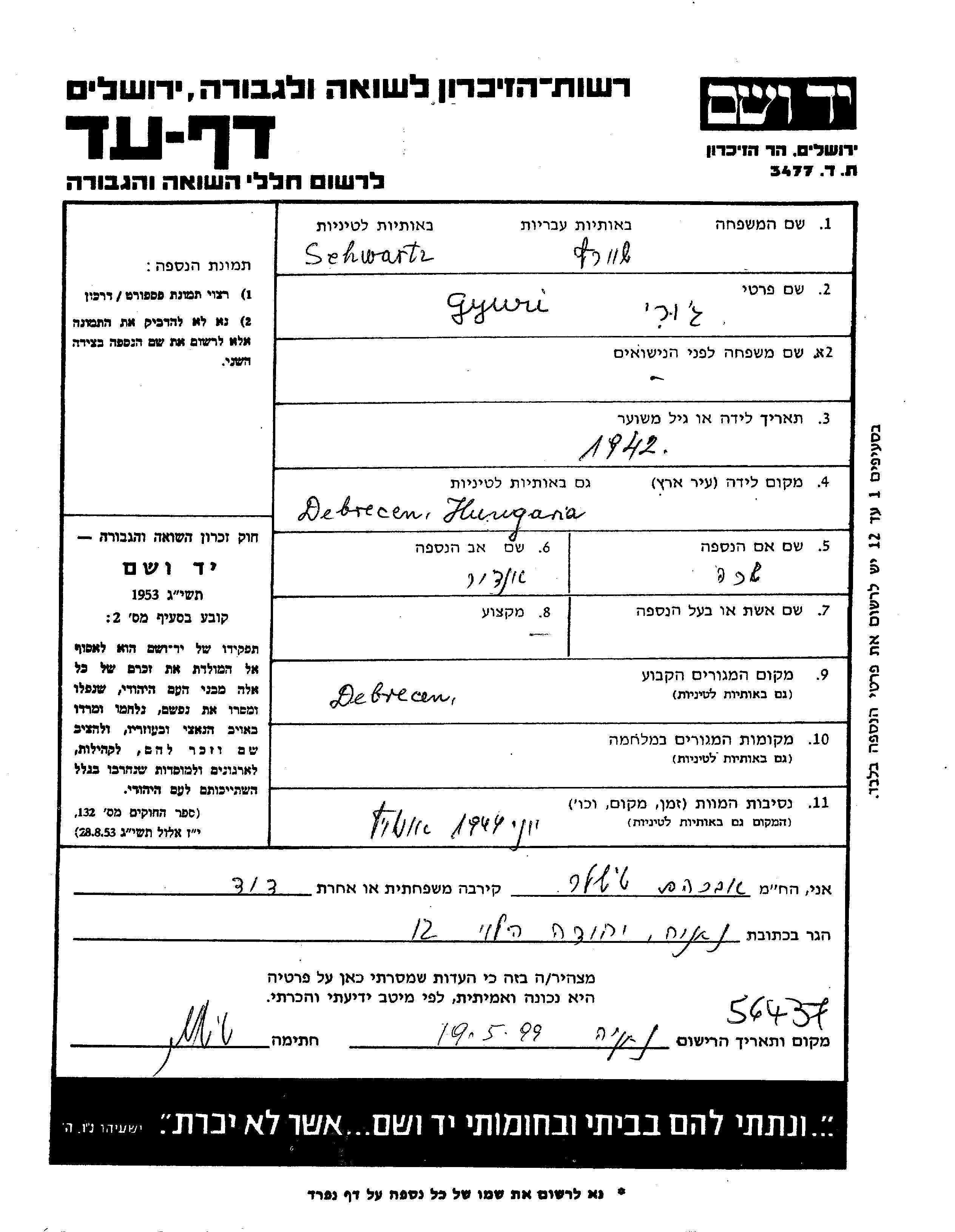 | Shvartz | Gyuri | 1942 | Debreczen, Hongrie | Feuille de témoignage |
