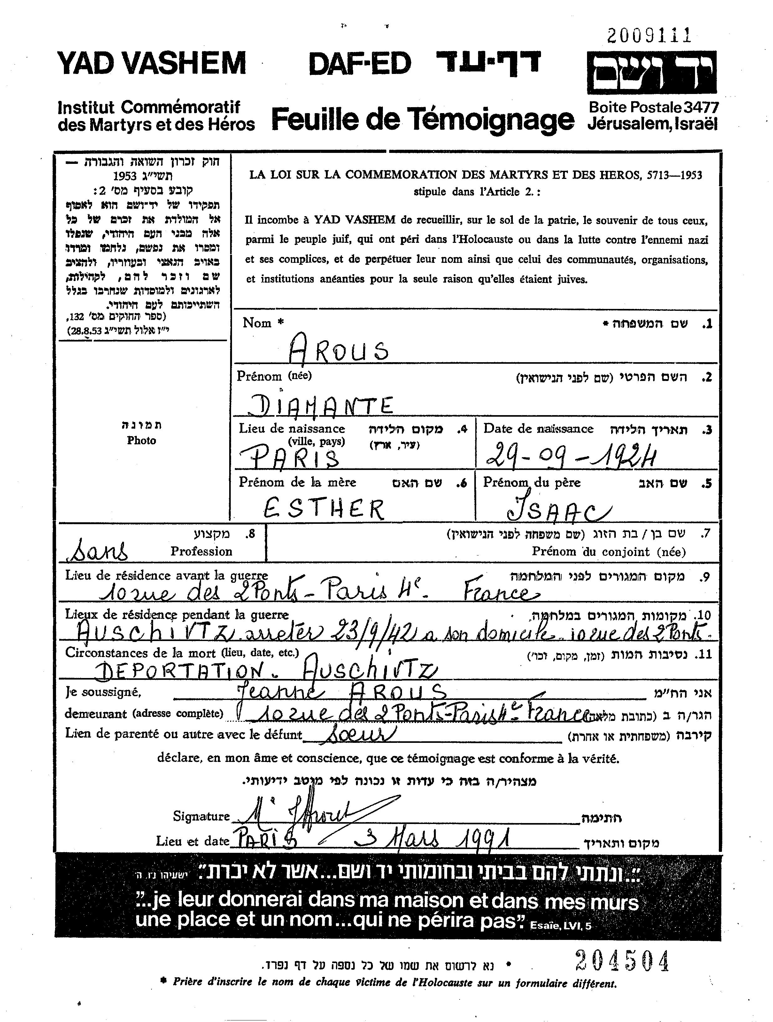 Arous Diamante 1924 Paris, France Feuille de témoignage