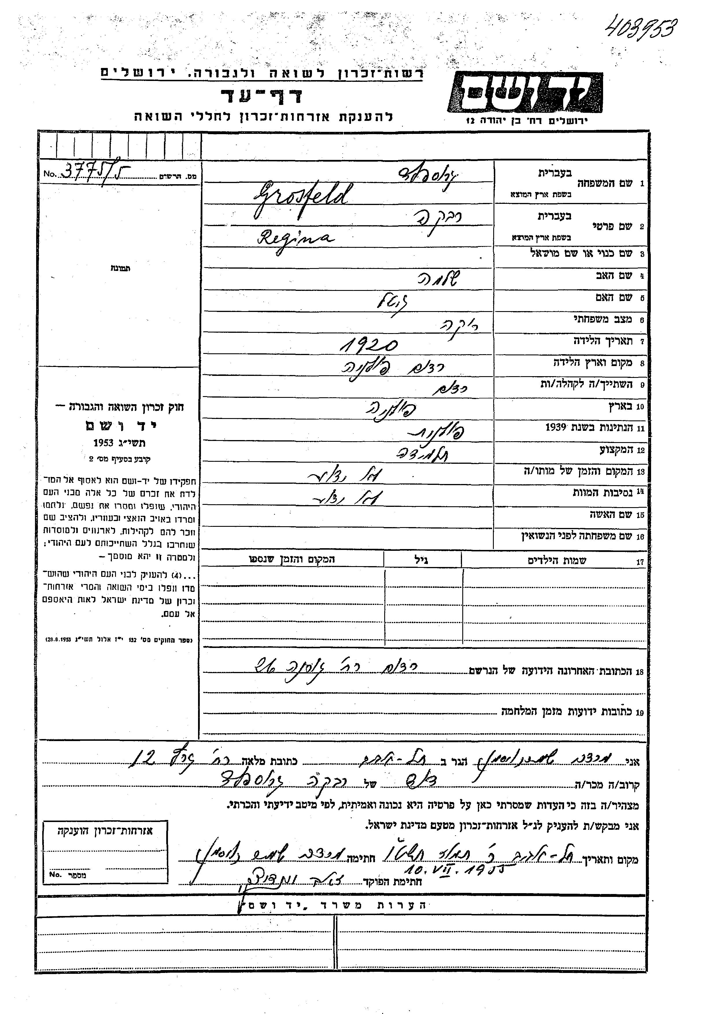 Grosfeld Regina Rivka 1920 Radom, Pologne Feuille de témoignage