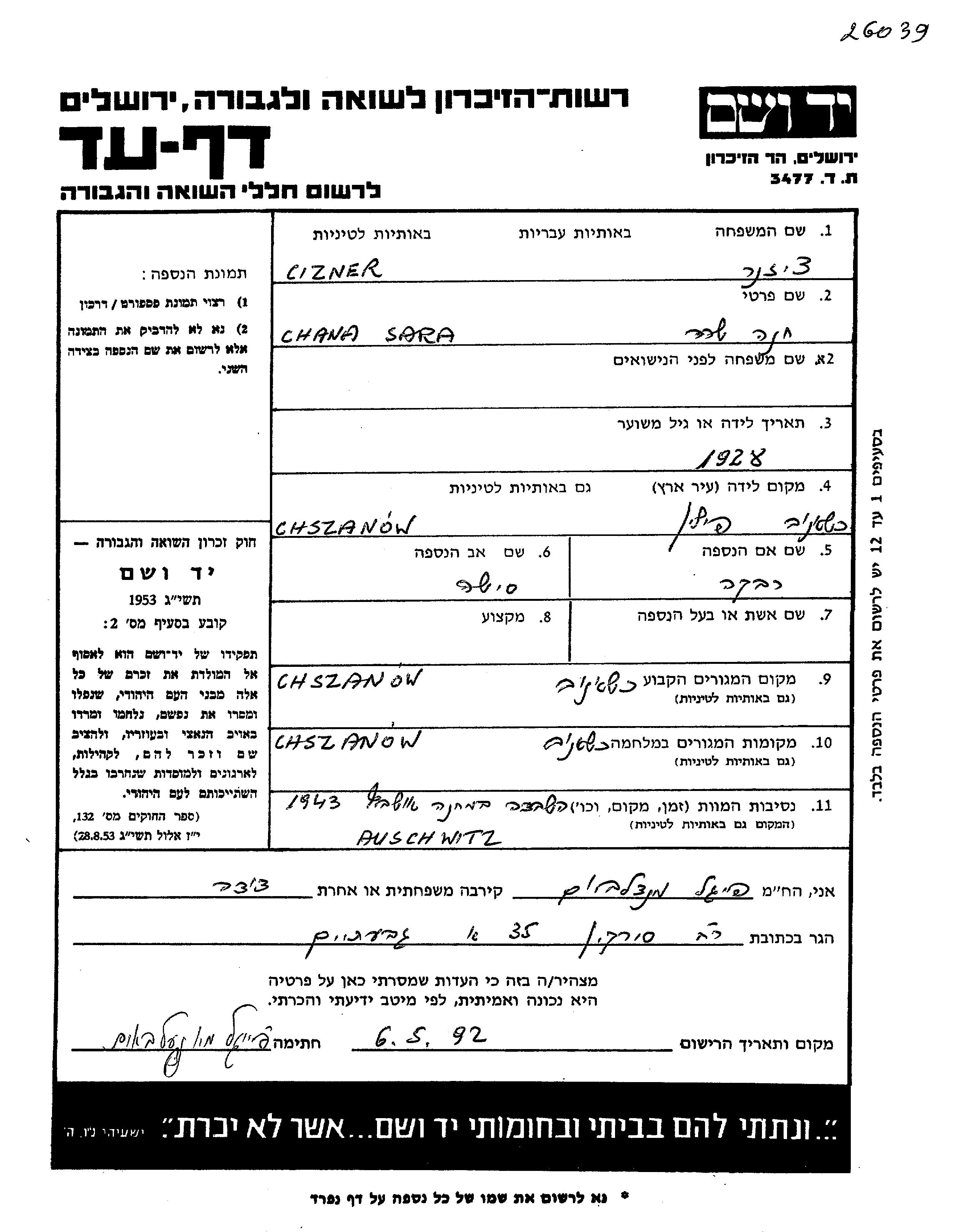 Cizner Chana Sara 1928 Chrzanow, Pologne Feuille de témoignage