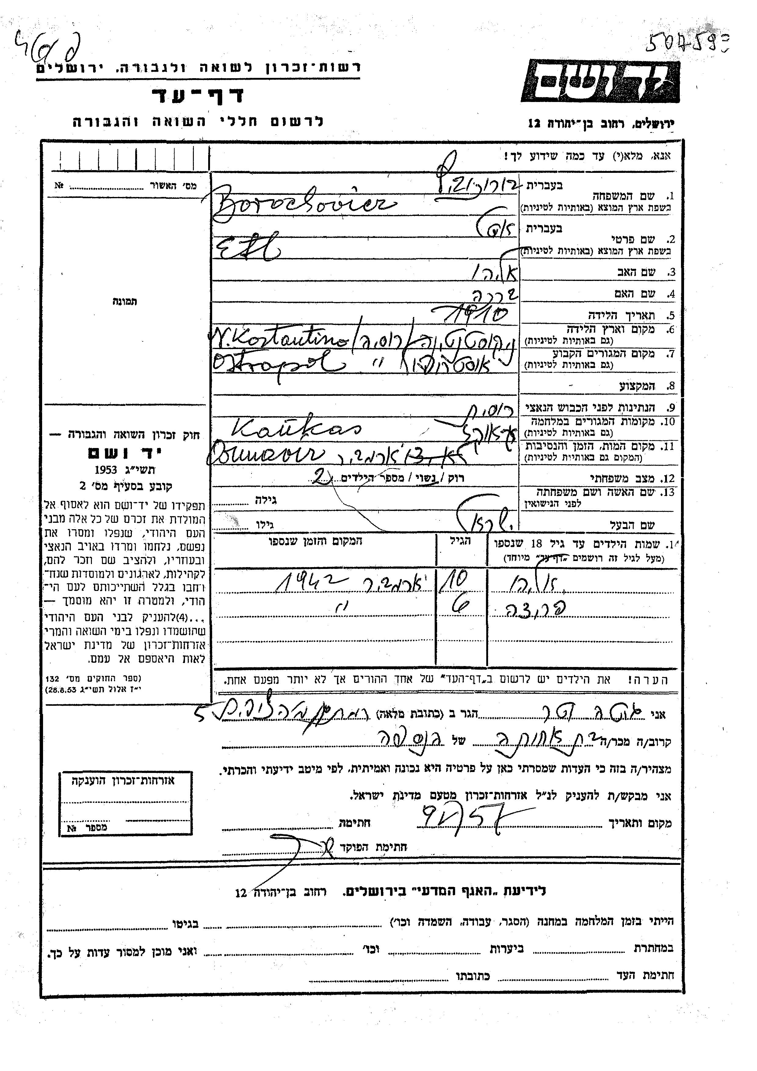 Borochovicz Etl Edel 1910 Ostropol, Ukraine (URSS) Feuille de témoignage