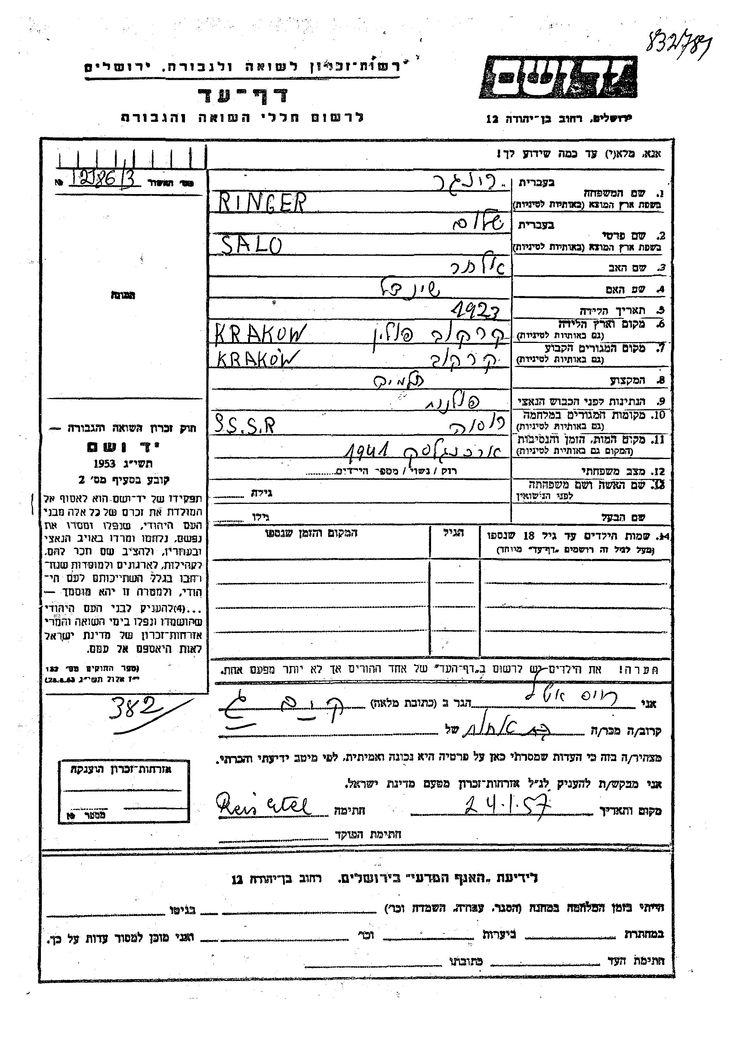 Salo Shalom Ringer est né à Krakow, Pologne en 1923. Il était Élève. Avant la seconde guerre mondiale il vivait à Krakow, Pologne.