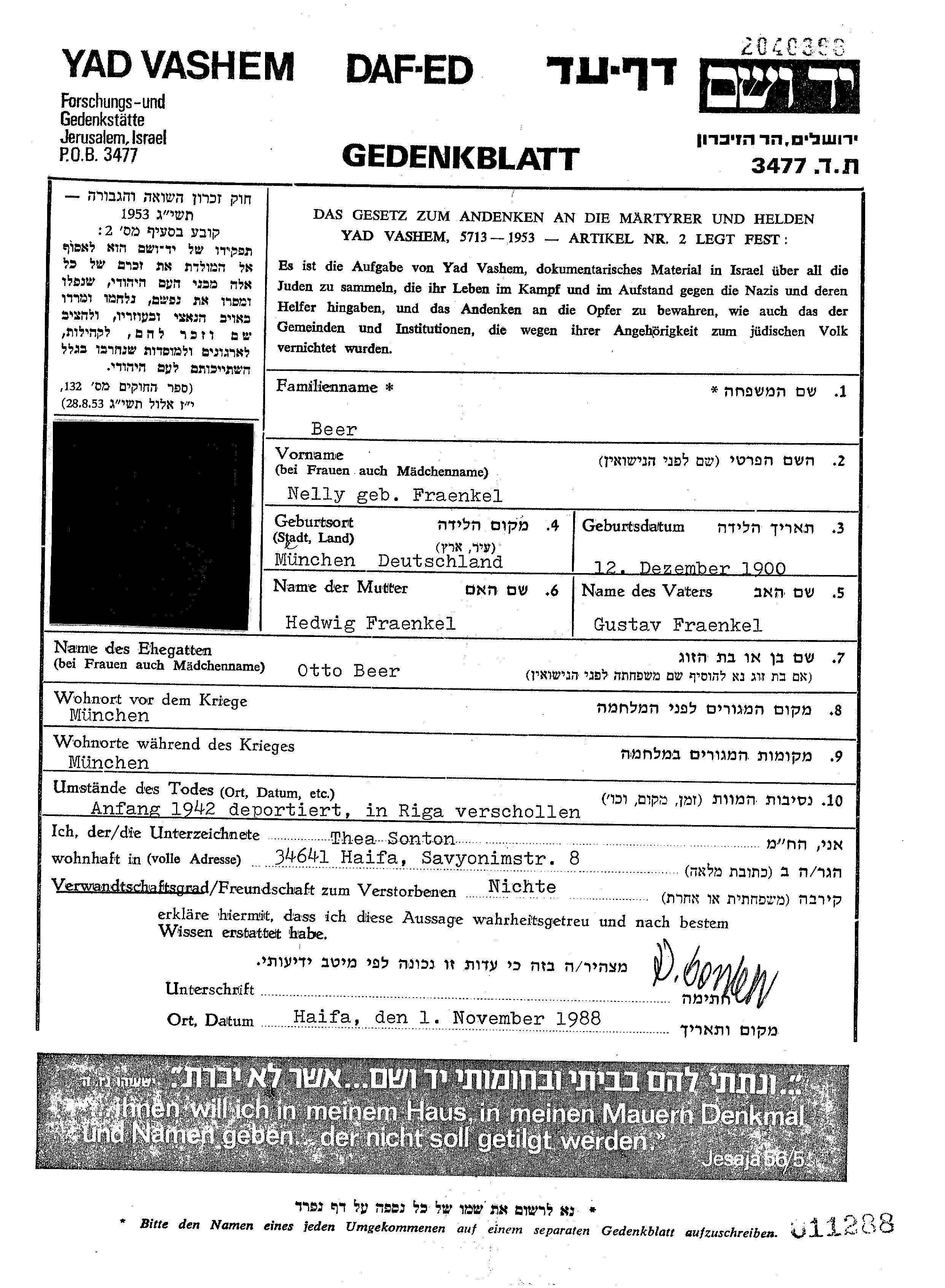 Neli Beer née Fraenkel est née en 1900. Elle était Femme au foyer. Avant la seconde guerre mondiale elle vivait à Muenchen, Allemagne.