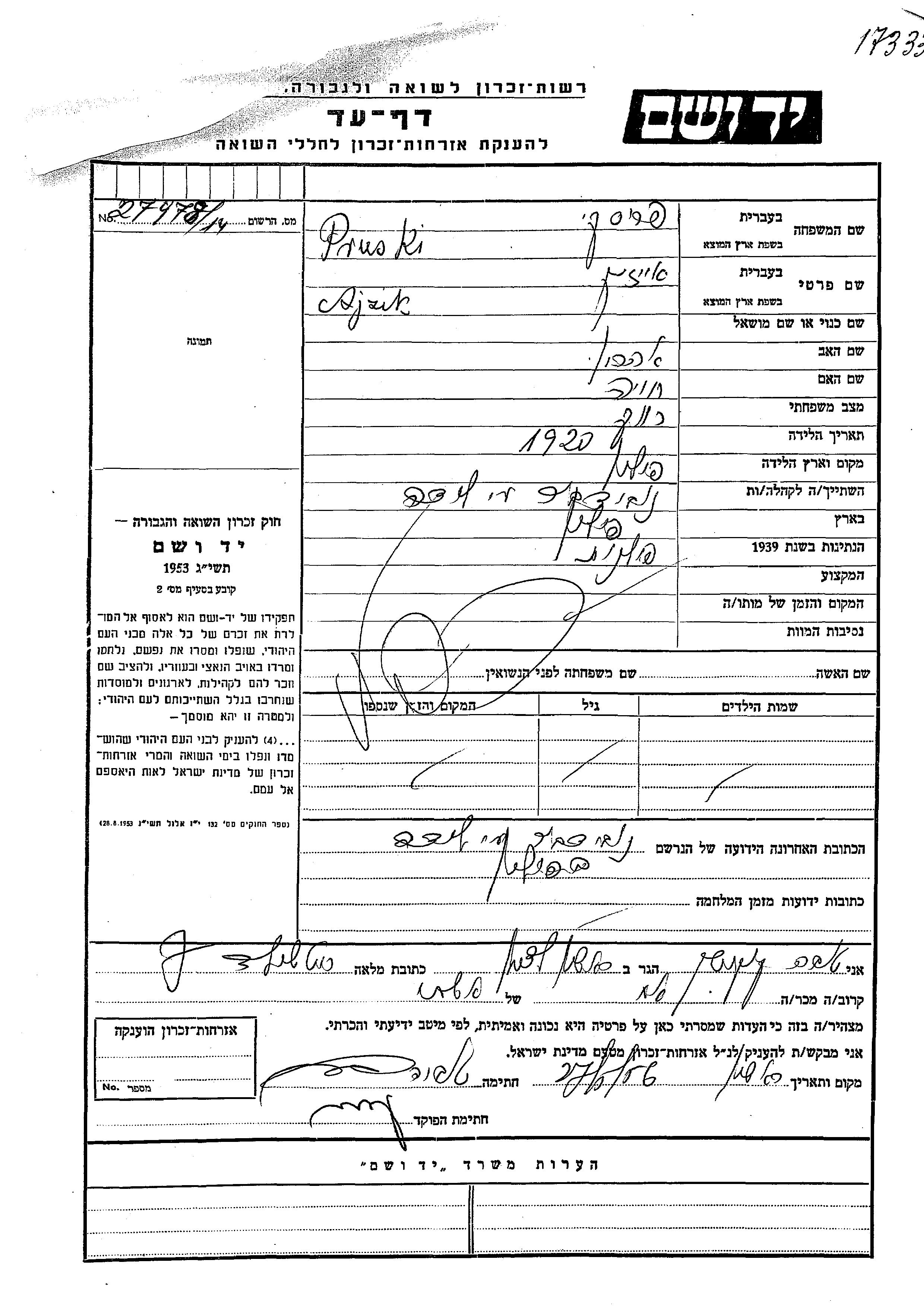 Yad Vashem - Pages of Testimony Names Memorial Collection