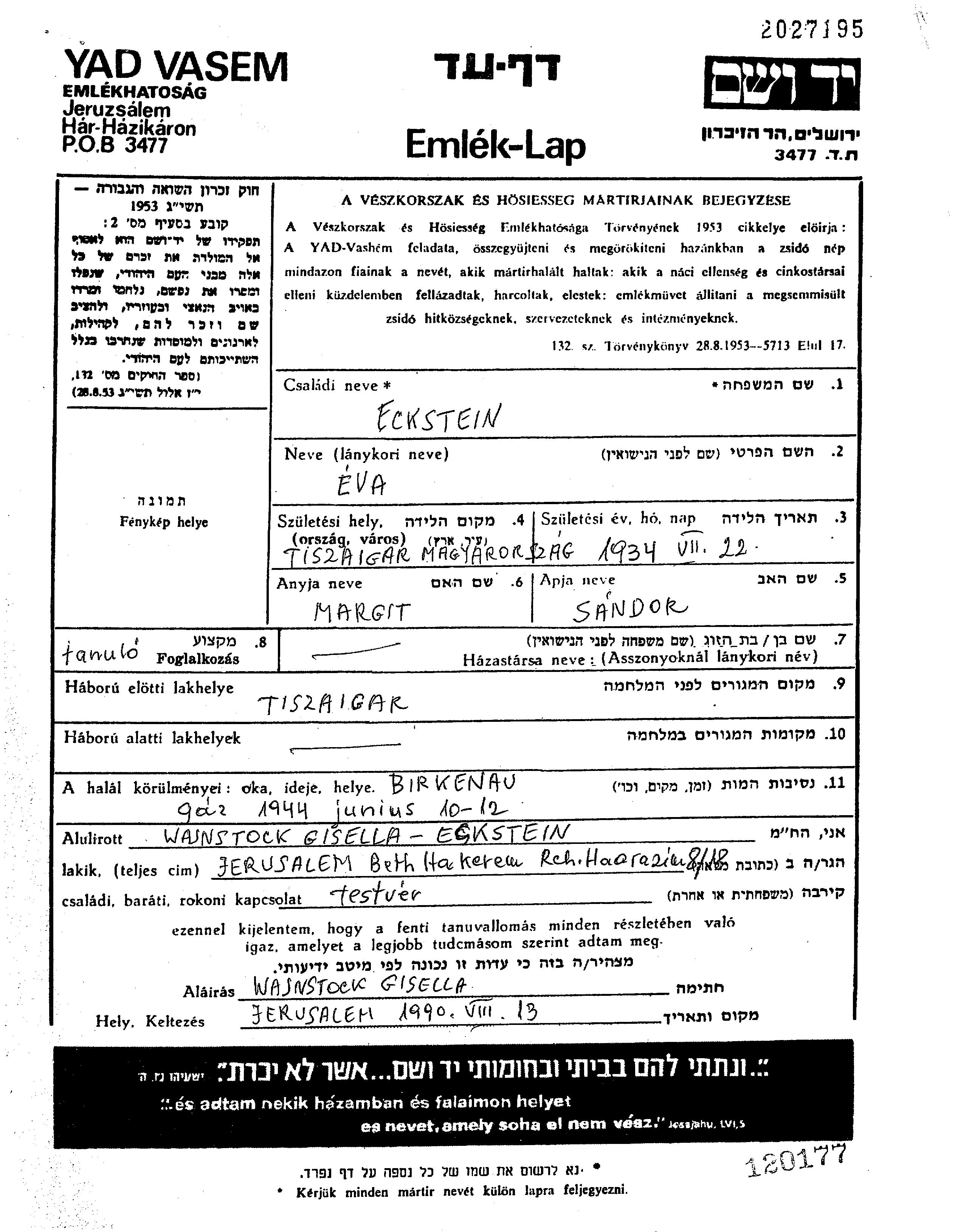 Eckstein Eva 1934 Tiszaigar, Hongrie Feuille de témoignage