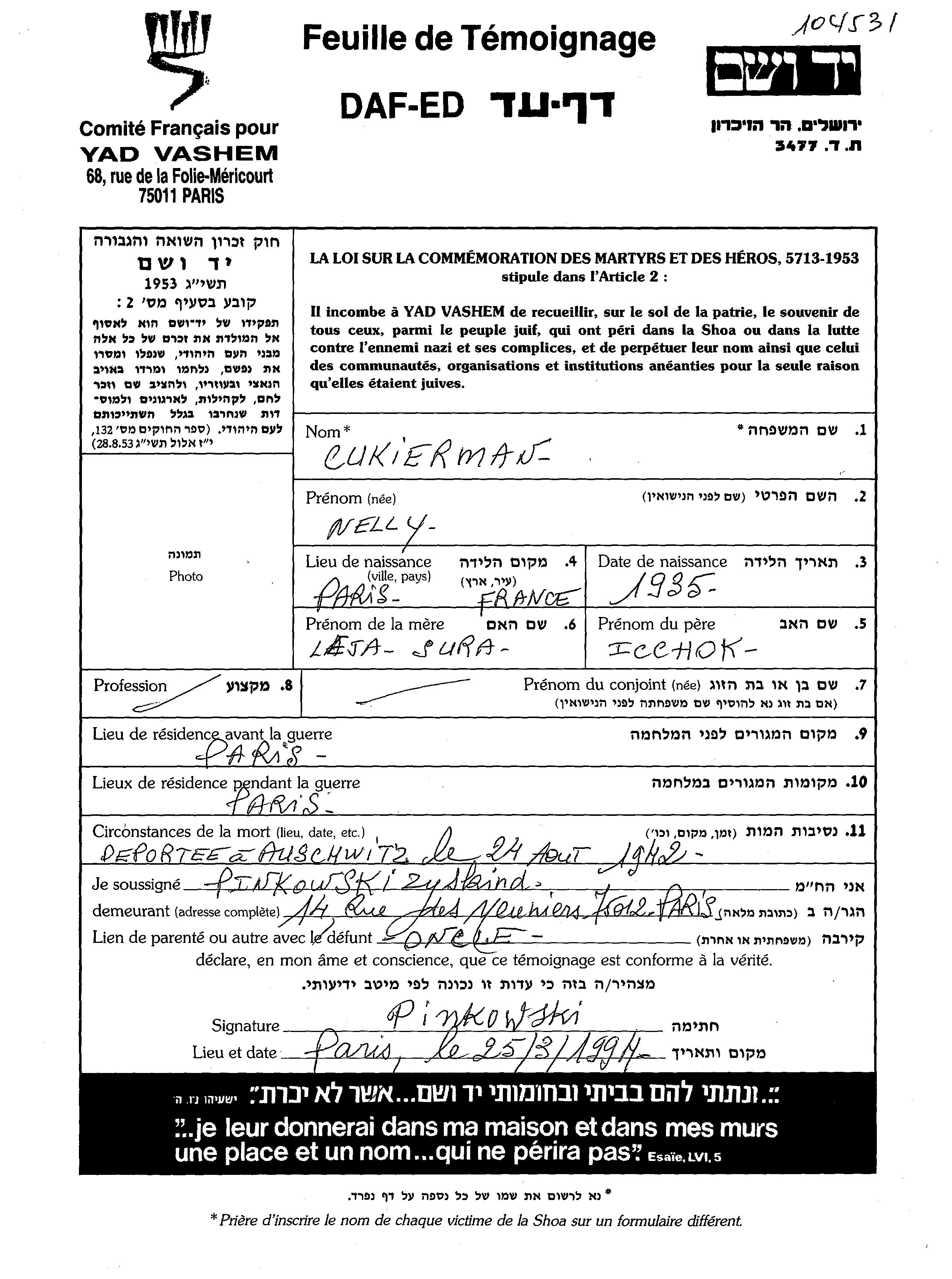 Cukierman Nelly 1935 Paris, France Feuille de témoignage