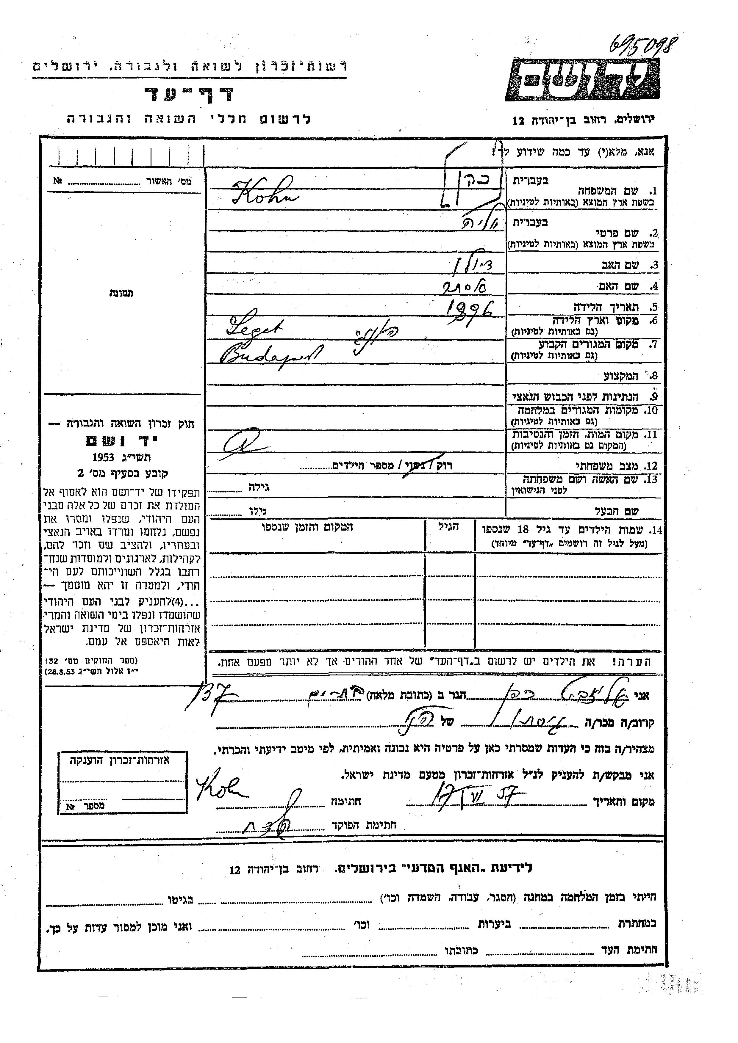 Yad Vashem - Pages of Testimony Names Memorial Collection