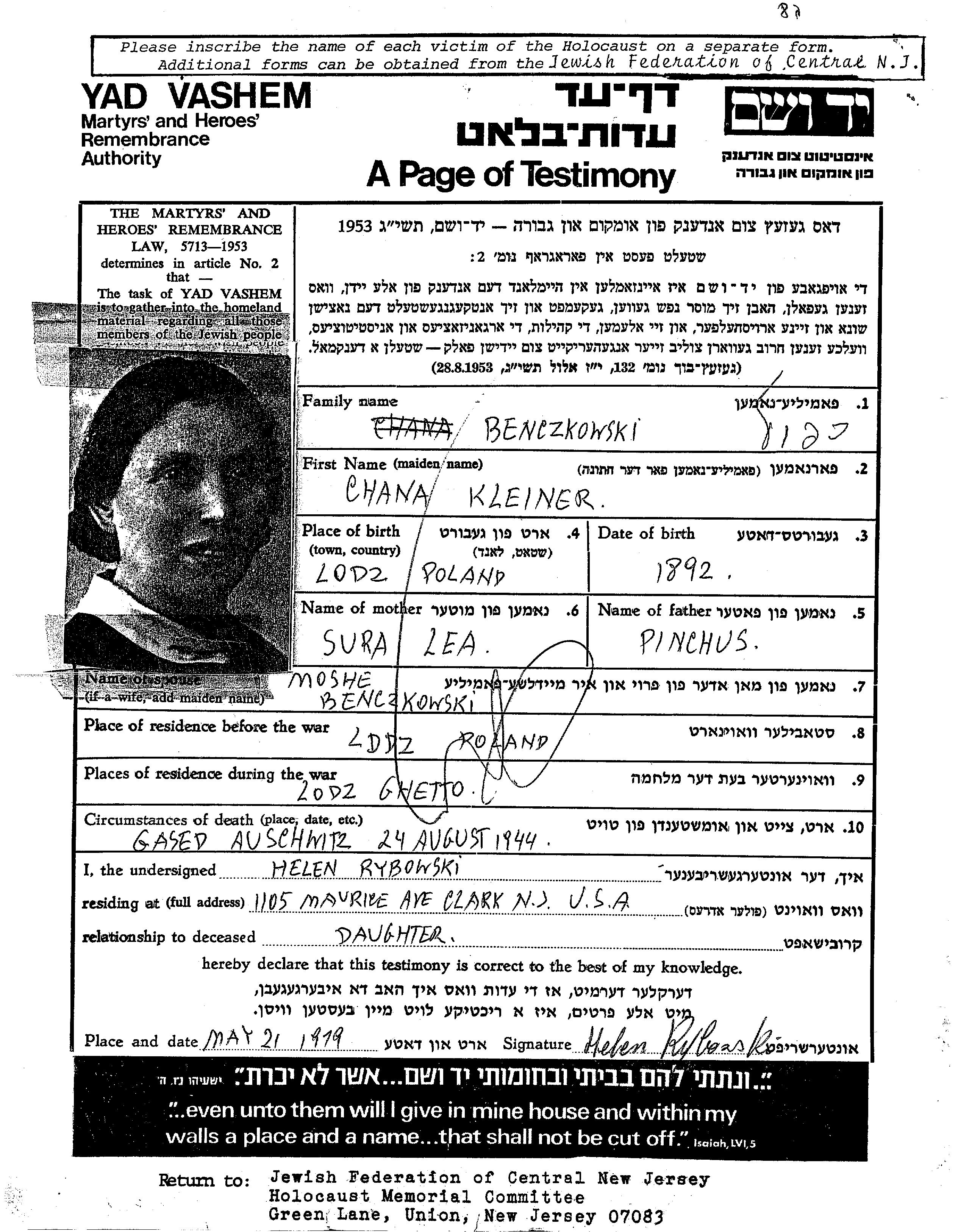 Benczkowski Chana 1892 Lodz, Pologne Feuille de témoignage