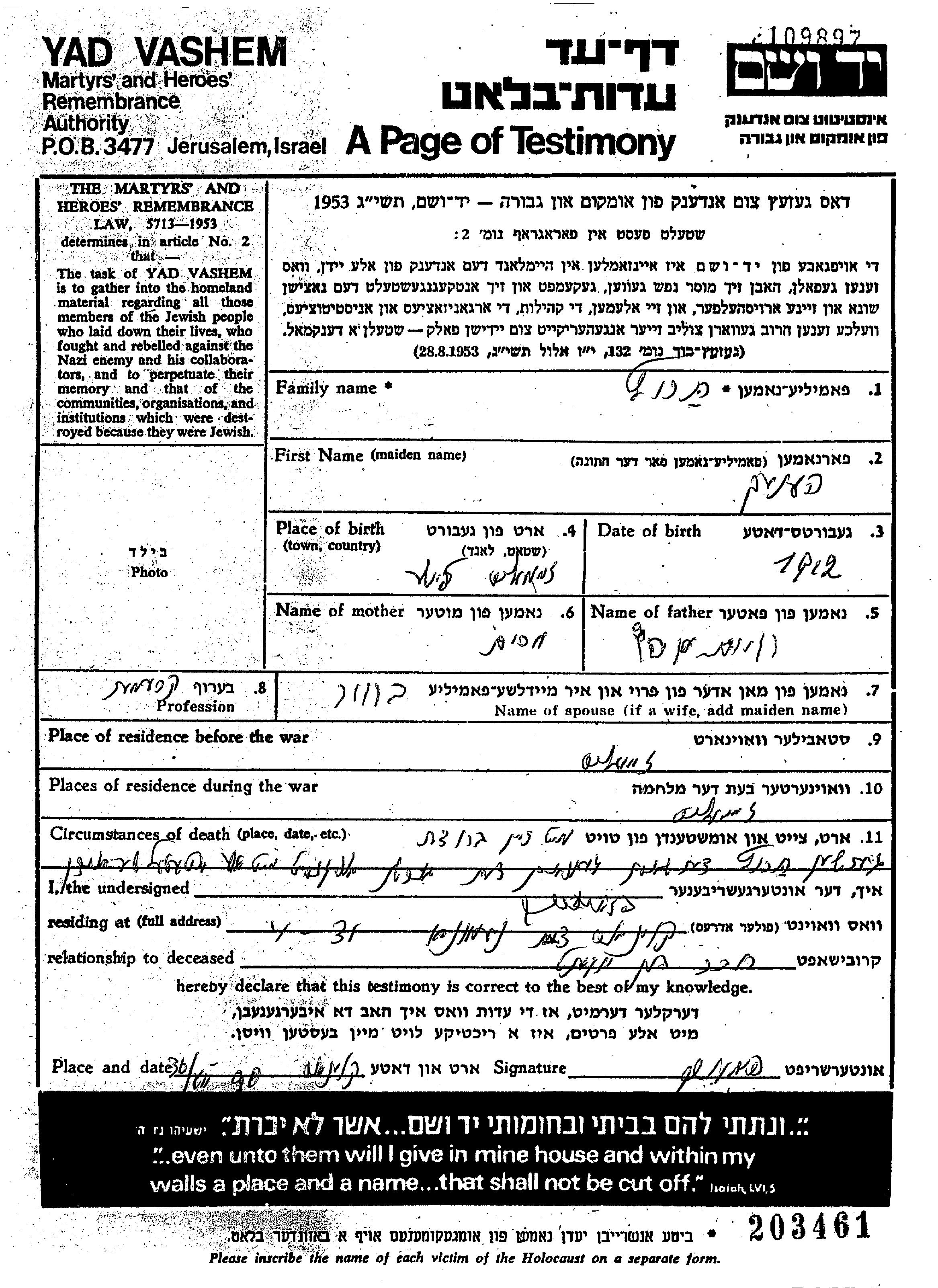 Yad Vashem - Pages of Testimony Names Memorial Collection