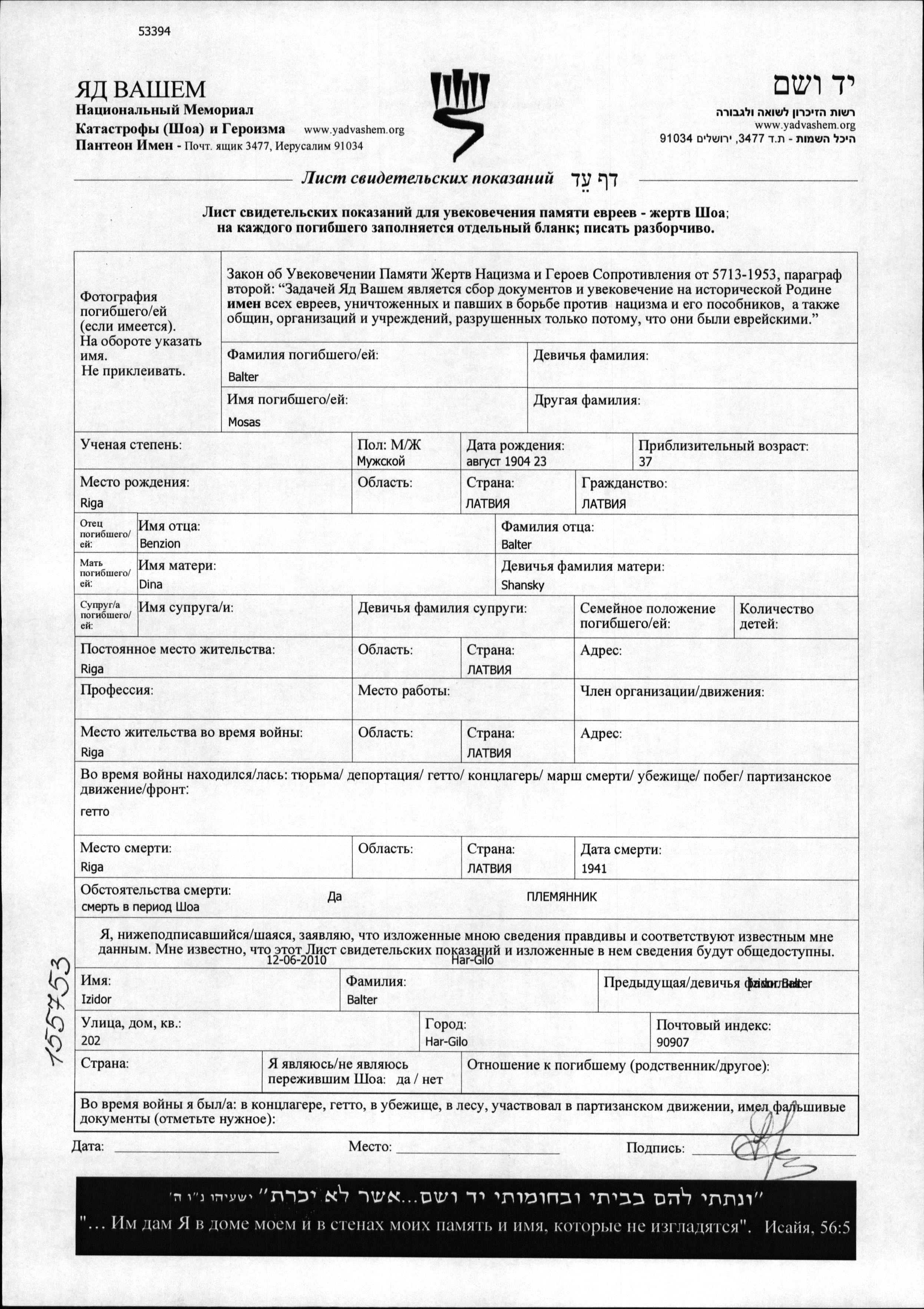 Balter | Mosas | 1904 | Riga, Lettonie | Feuille de témoignage (digitale) |