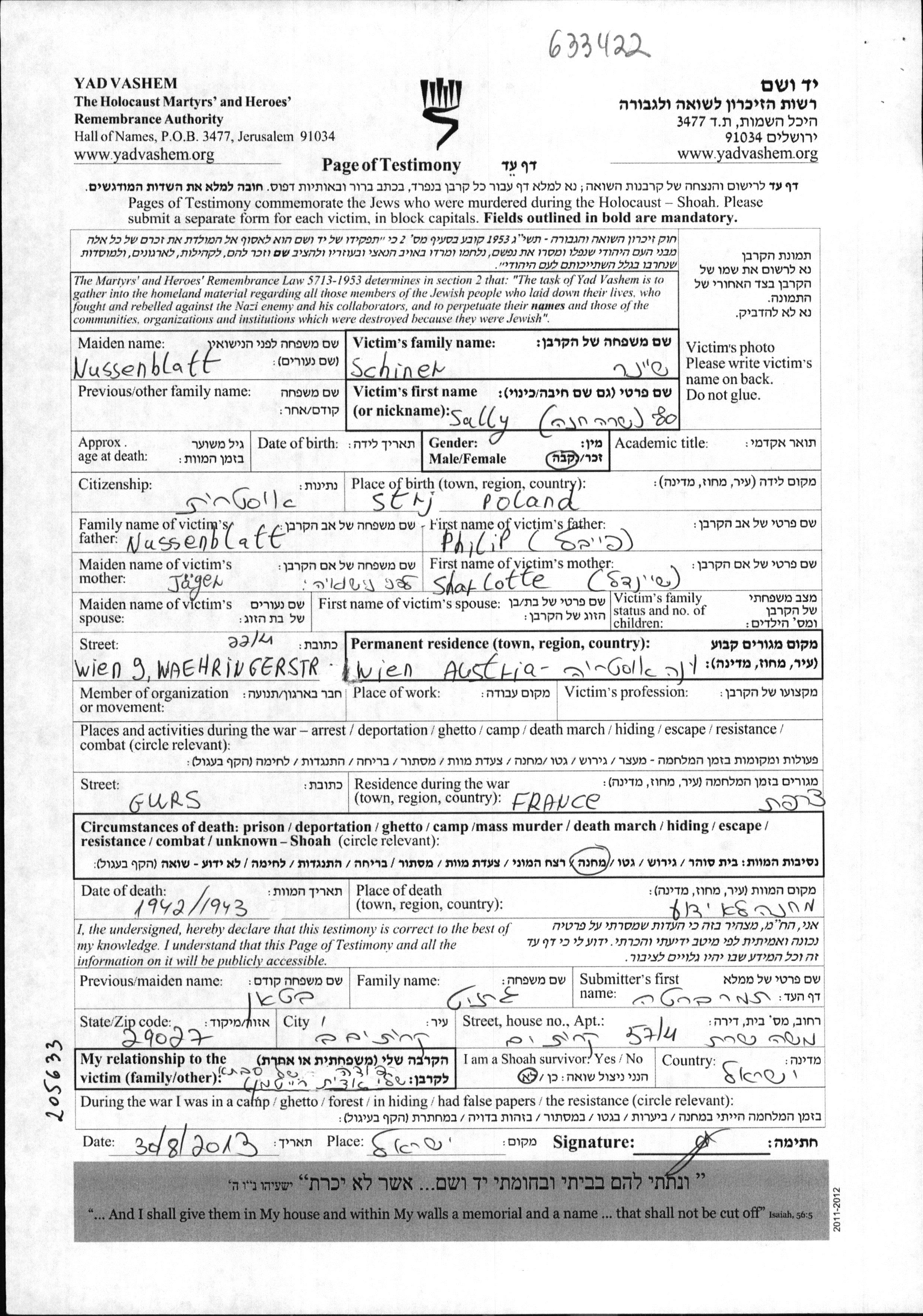 Schiner Sally Sali Sara Chana Wien, Autriche Feuille de témoignage