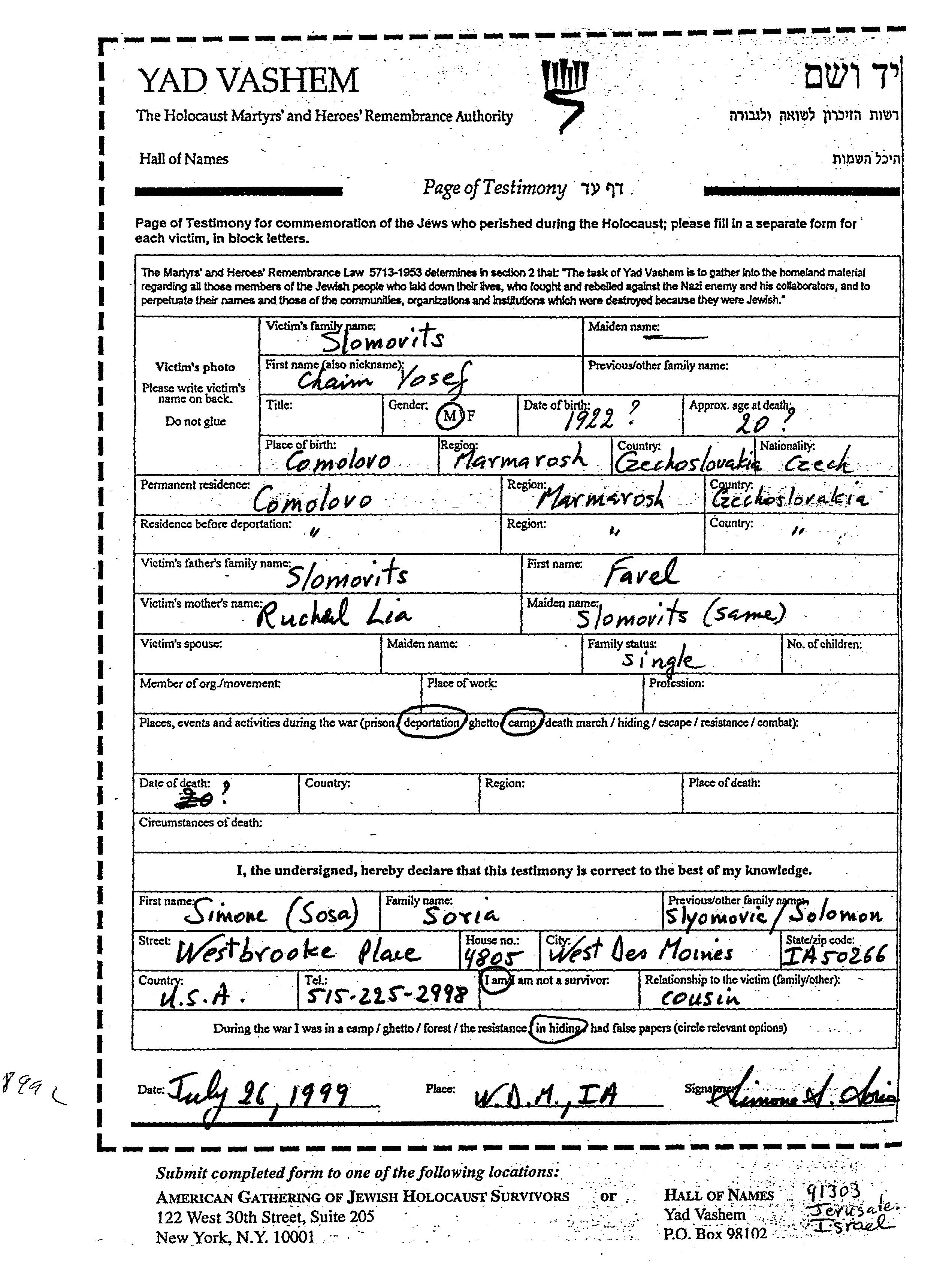 Slomovits Chaim Yosef 1922 Comalovo, Tchécoslovaquie Feuille de témoignage