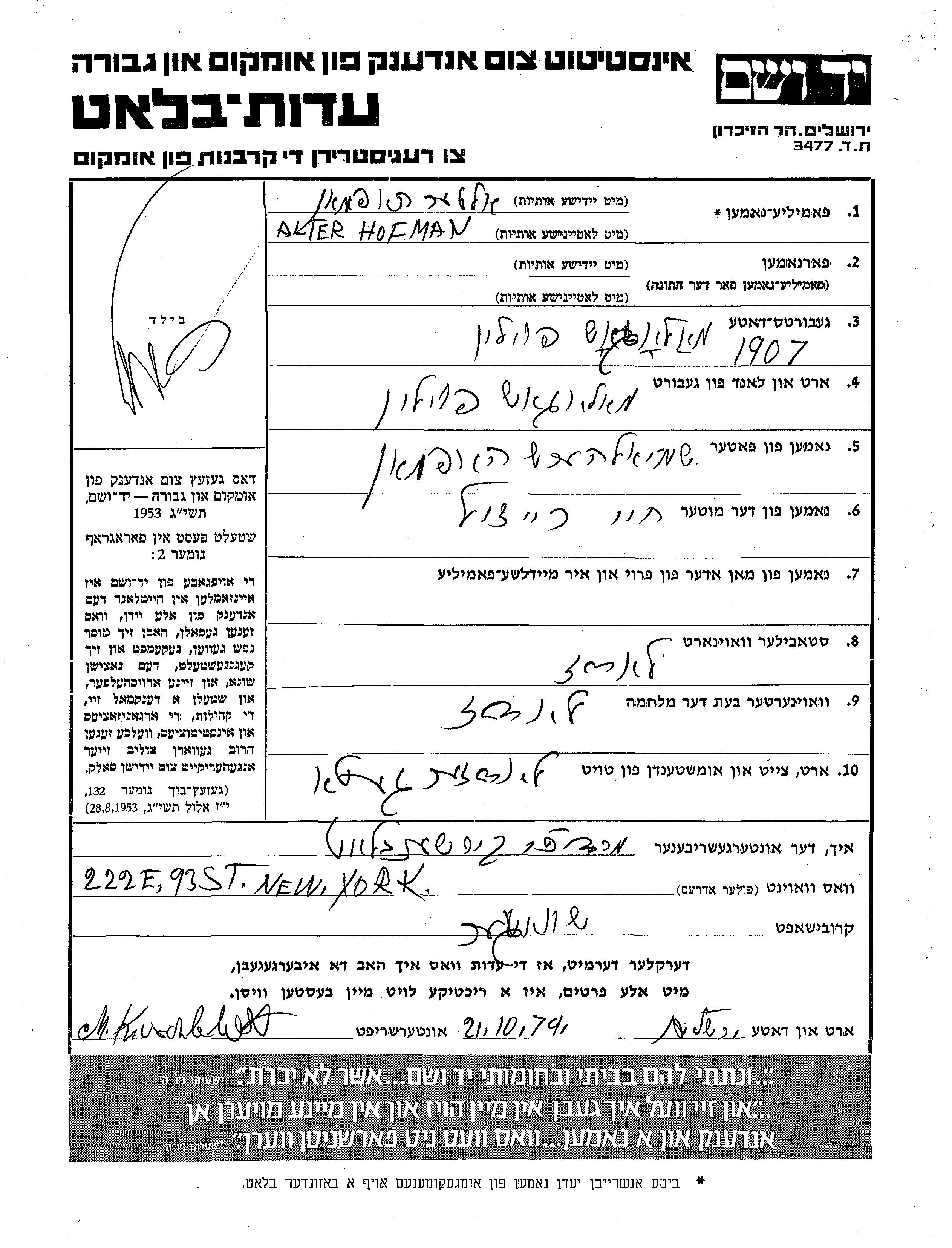 Hofman | Alter | 1907 | Lodz, Pologne | Feuille de témoignage |