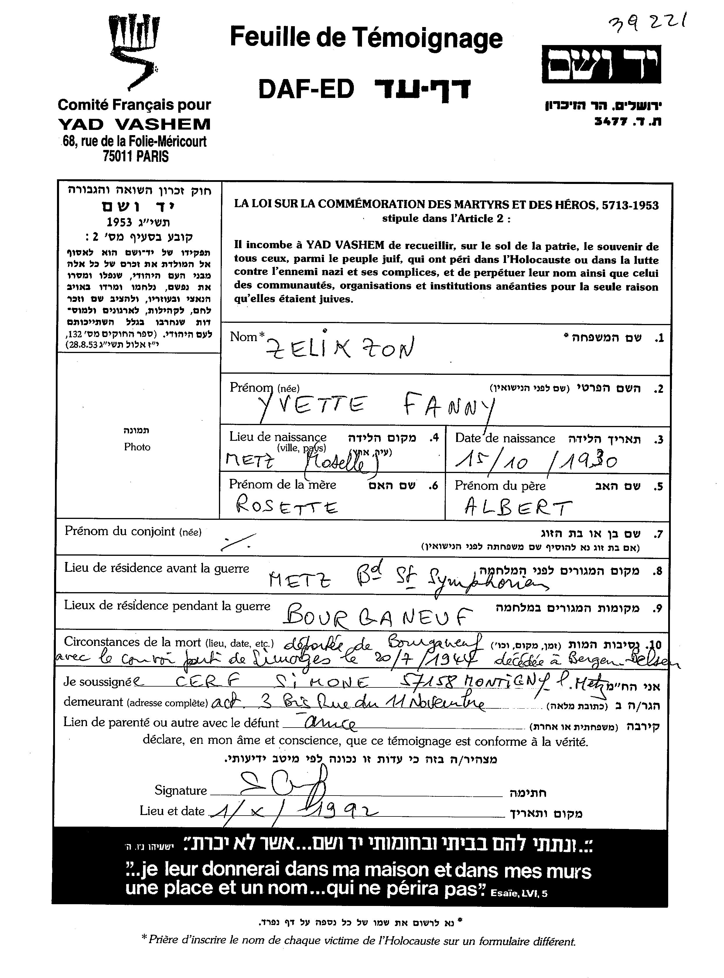 Zelikzon Yvette Fanny 1930 Metz, France Feuille de témoignage
