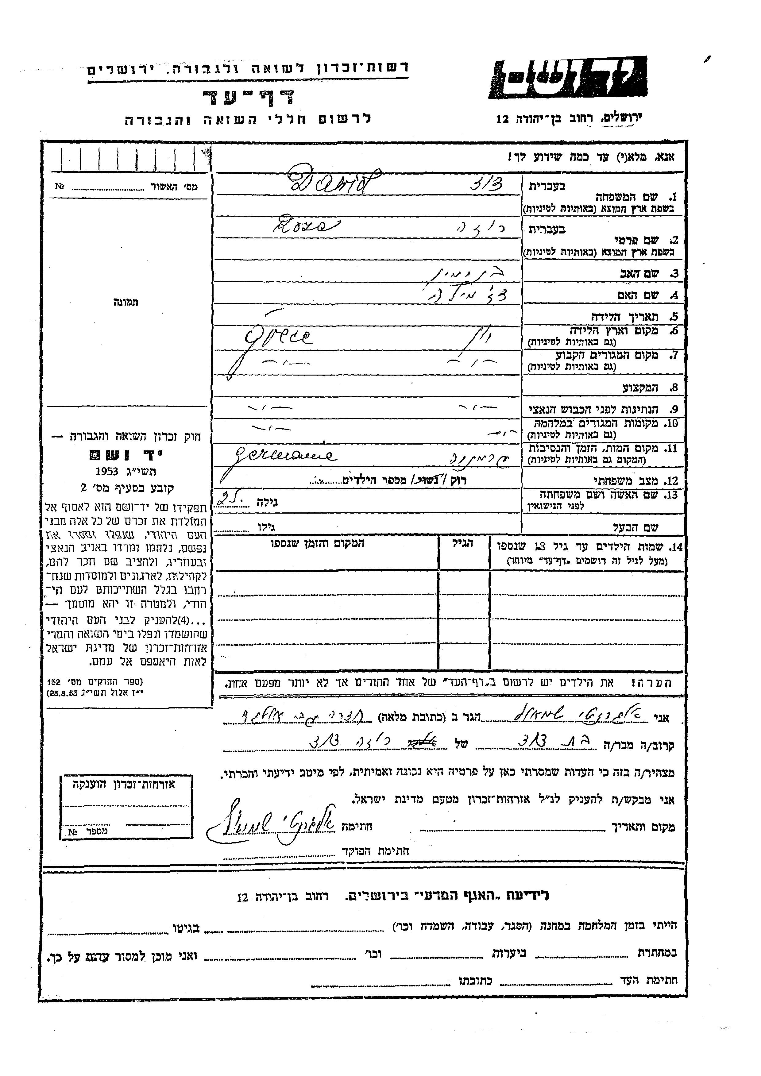 Dawid Roza endroit inconnu, Feuille de témoignage