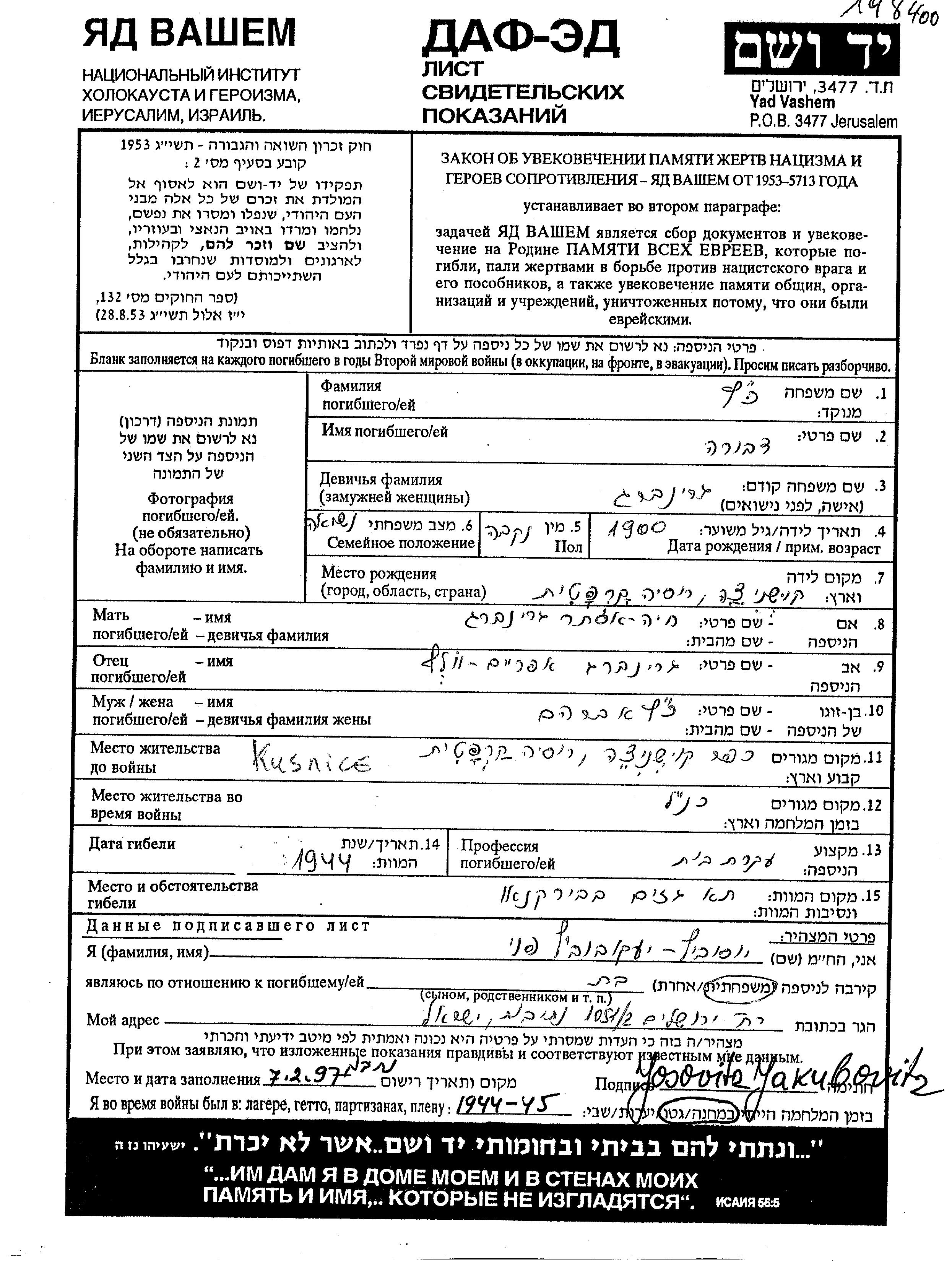 Dora Dvora Katz née Gruenberg est née à Kusnice, Tchécoslovaquie en 1900. Elle était Femme au foyer. Avant la seconde guerre mondiale elle vivait à Kusnice, Tchécoslovaquie. Dora Dvora a été assassinée pendant la Shoah. Lieu de la mort: endroit inconnu en 1944.