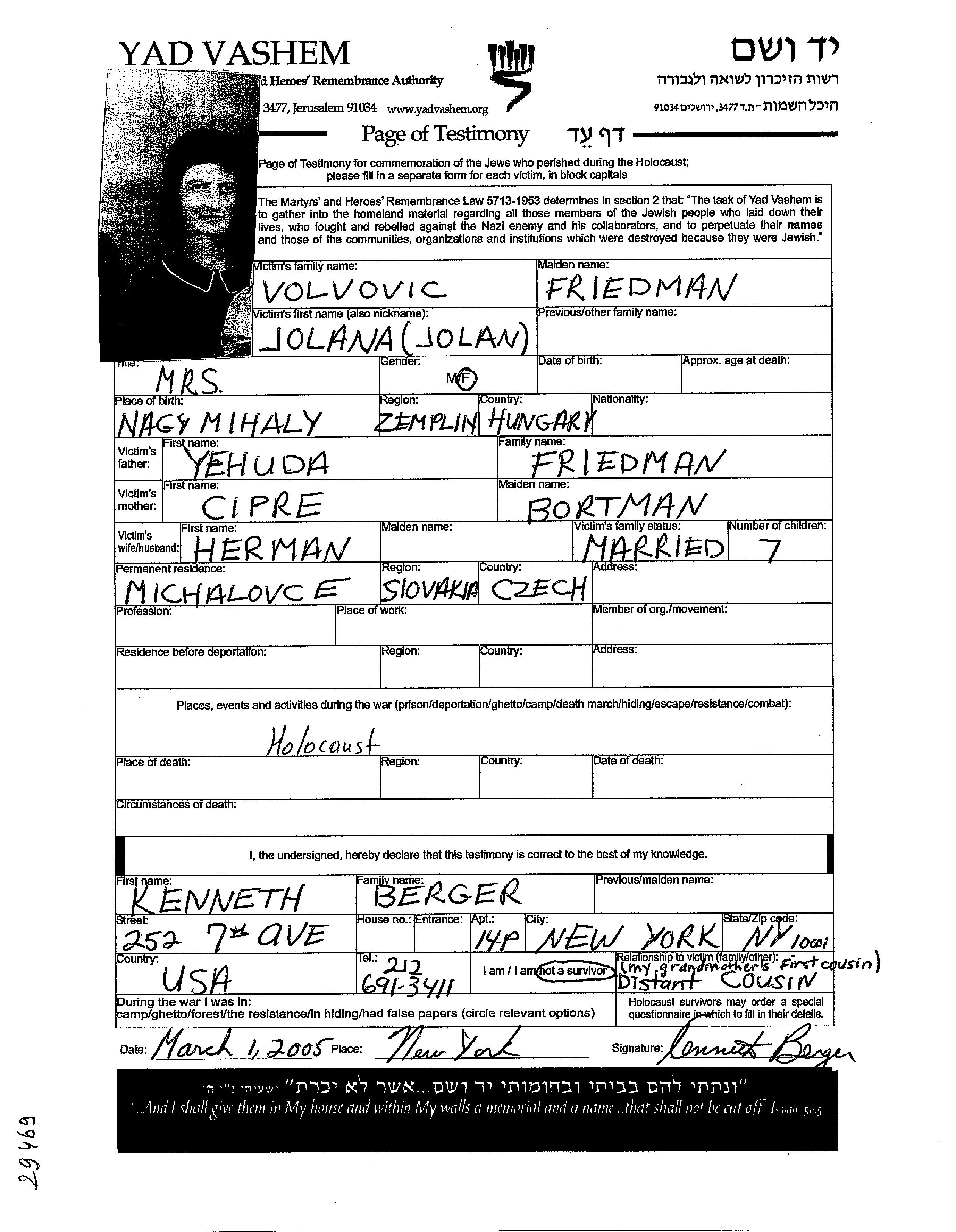 Volvovic | Jolan | Michalovce, Tchécoslovaquie | Feuille de témoignage | |