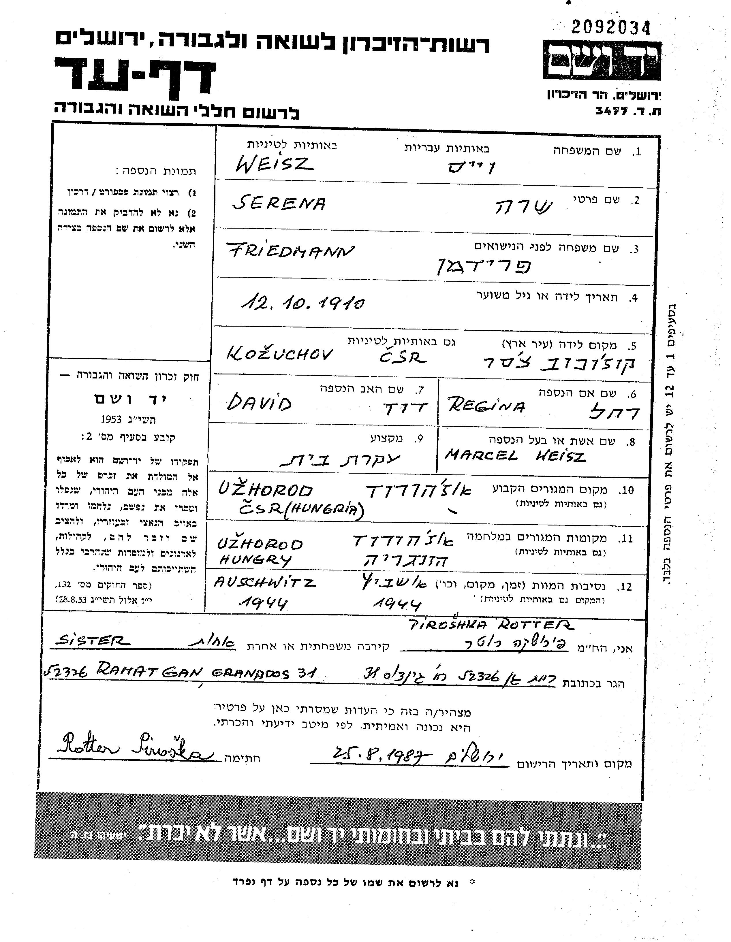 Weisz Serena 1910 Uzhorod, Tchécoslovaquie Feuille de témoignage