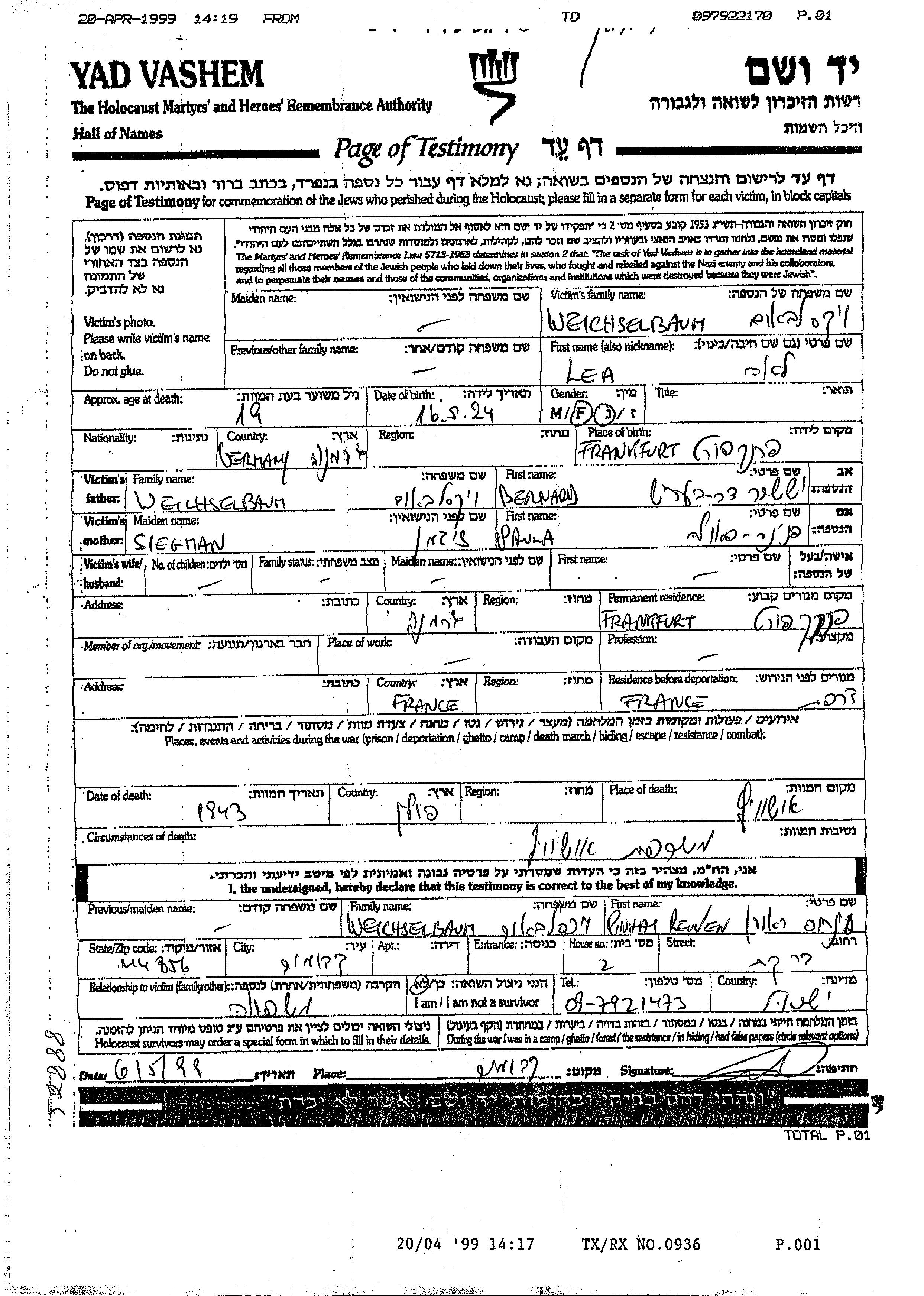 Weichselbaum Lea 1924 Frankfurt, Allemagne Feuille de témoignage