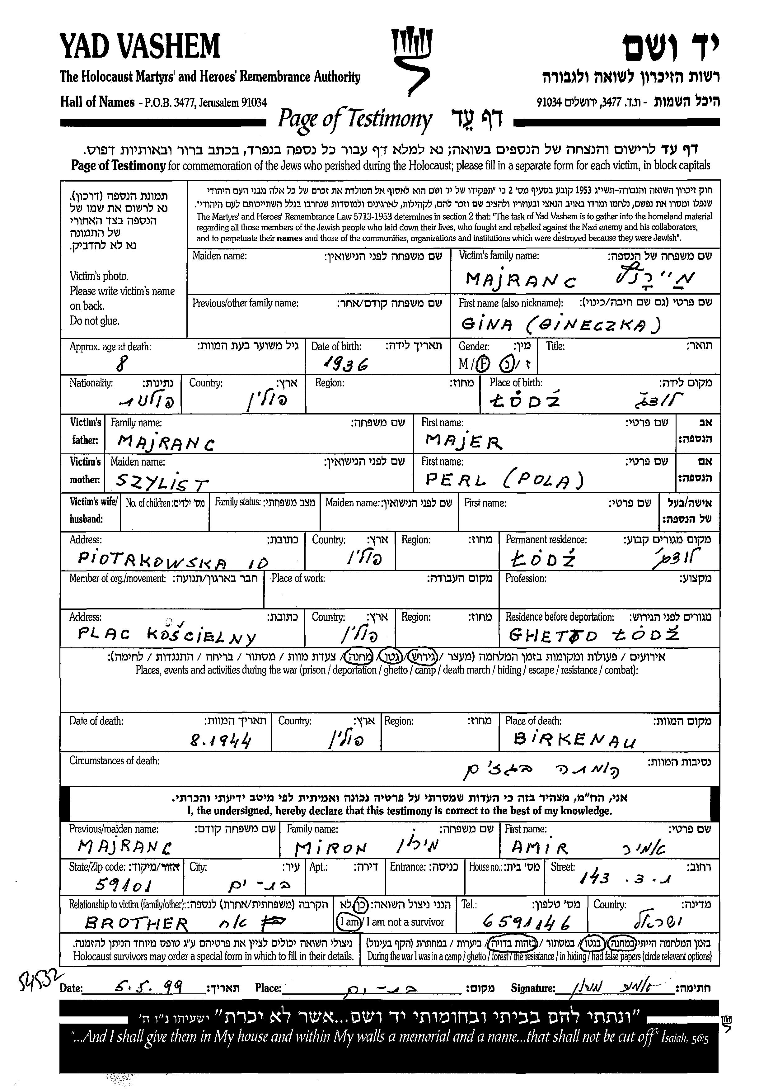 Majranc Gina 1936 Lodz, Pologne Feuille de témoignage