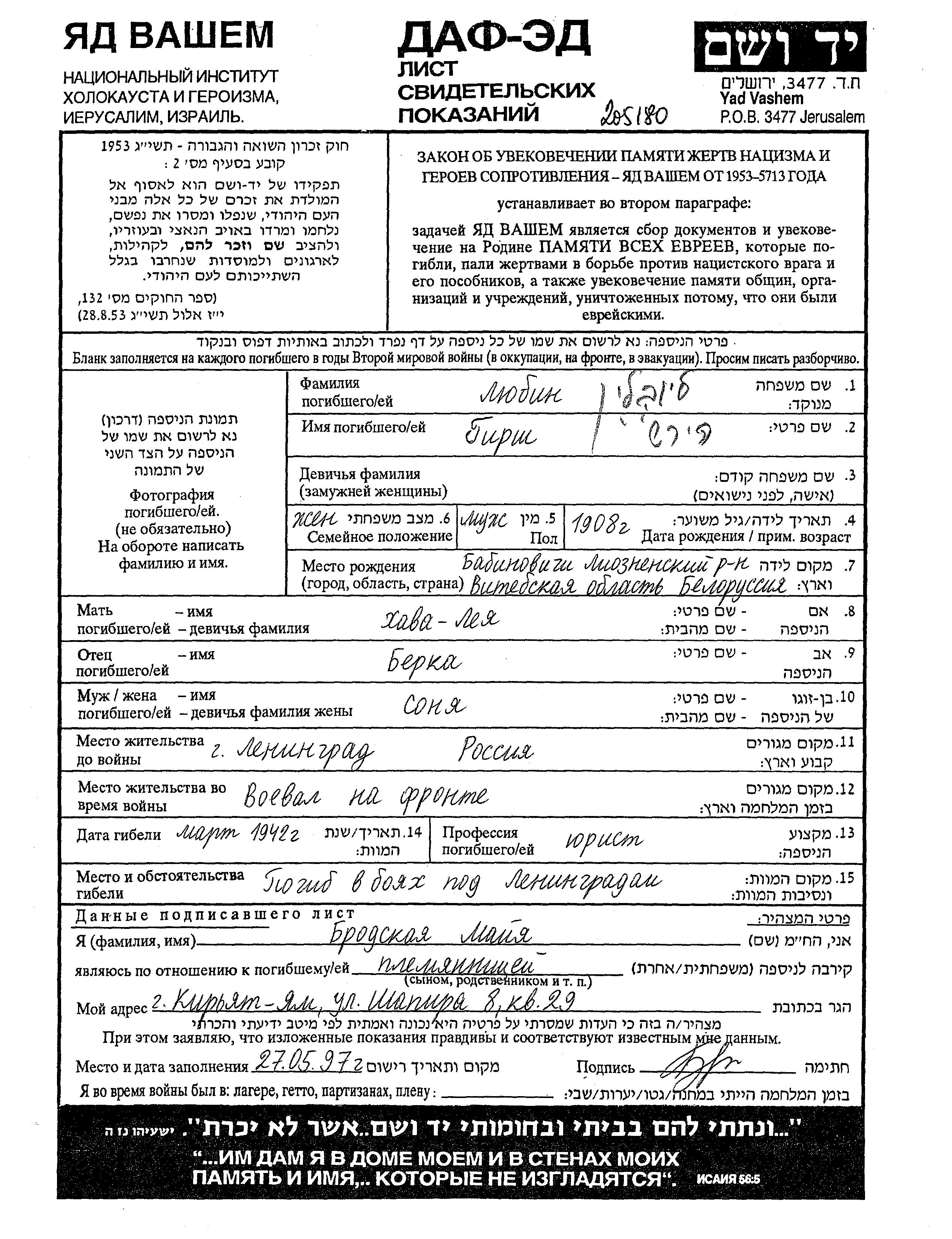 Hirsh Lyubin est né à Babinovichi, Bélorussie (URSS) en 1908. Il était Juriste. Avant la seconde guerre mondiale il vivait à Leningrad, Russie (URSS).