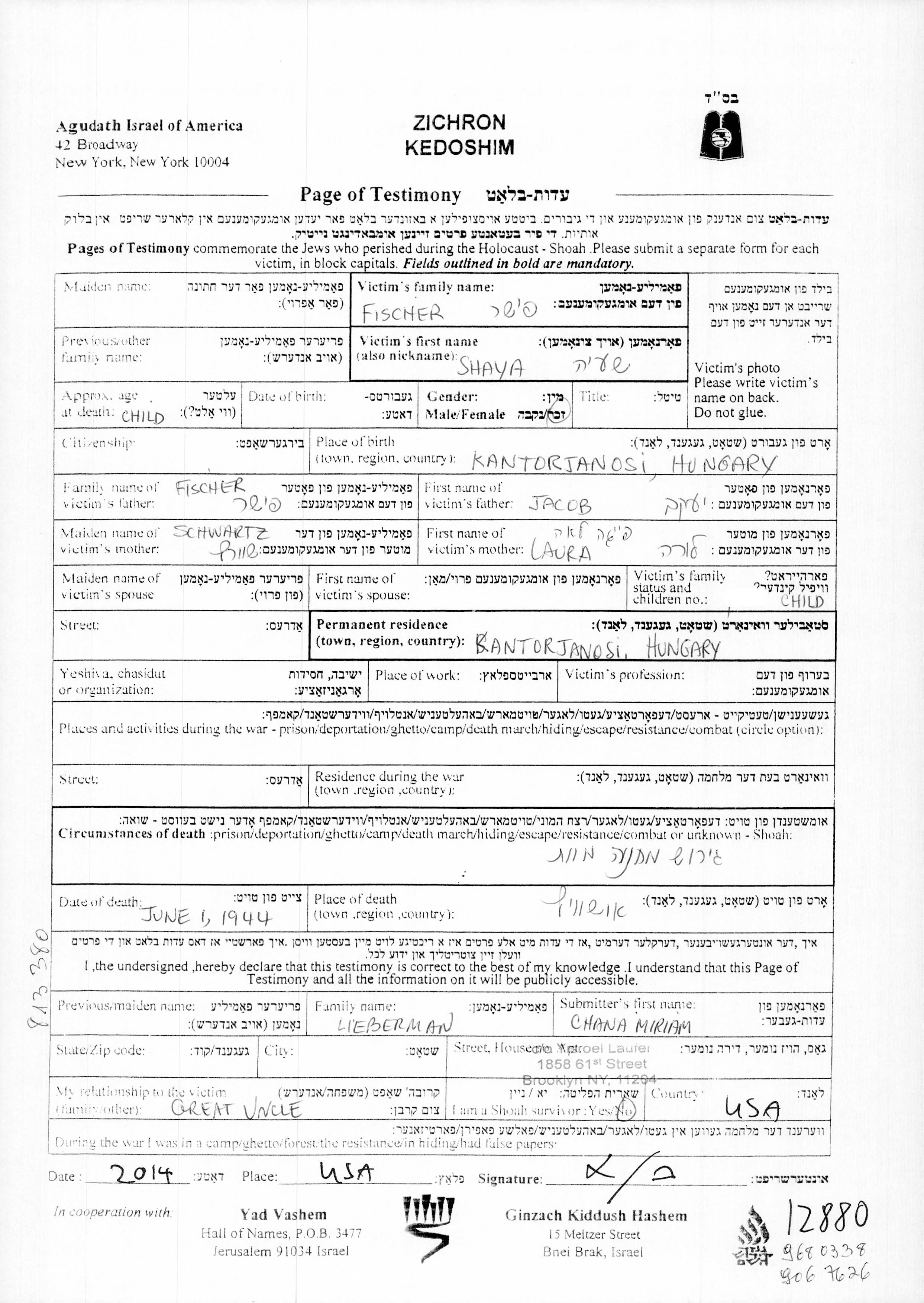 Fischer Shaya Kantorjanosi, Hongrie Feuille de témoignage