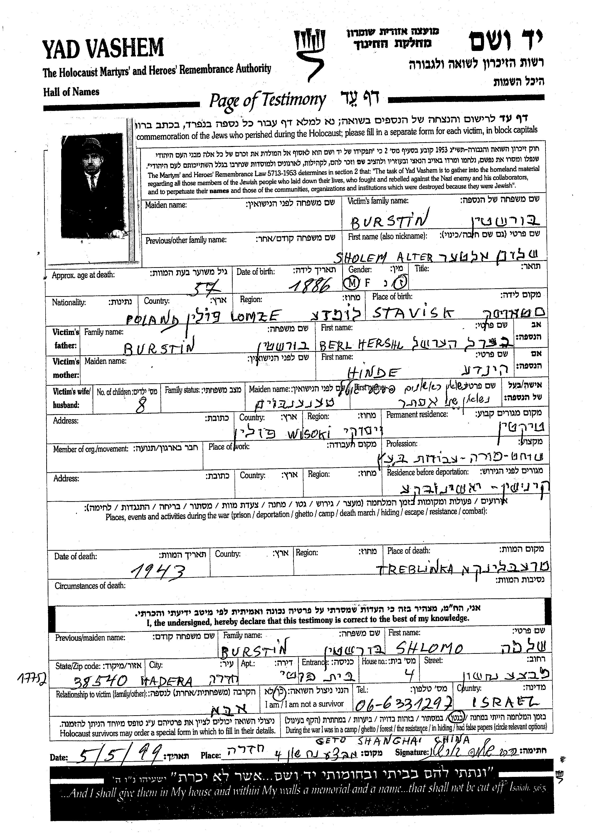 Burstein Shalom Alter 1886 Tiktin, Pologne Feuille de témoignage