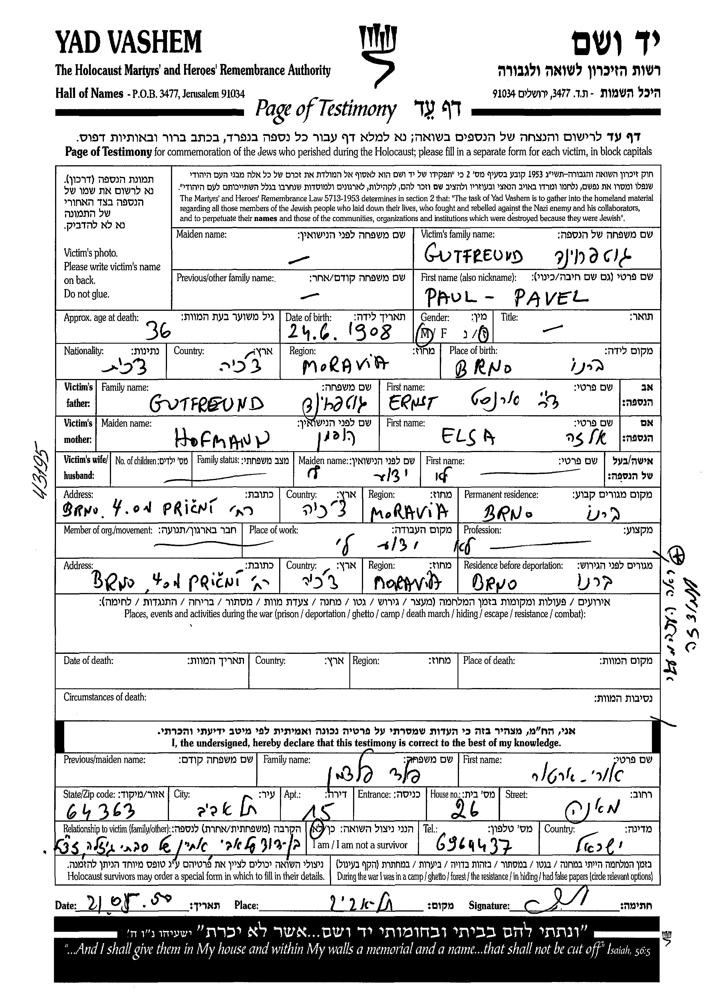 Paul Pavel Gutfreund est né à Brno, Tchécoslovaquie en 1908. Avant la seconde guerre mondiale il vivait à Brno, Tchécoslovaquie.