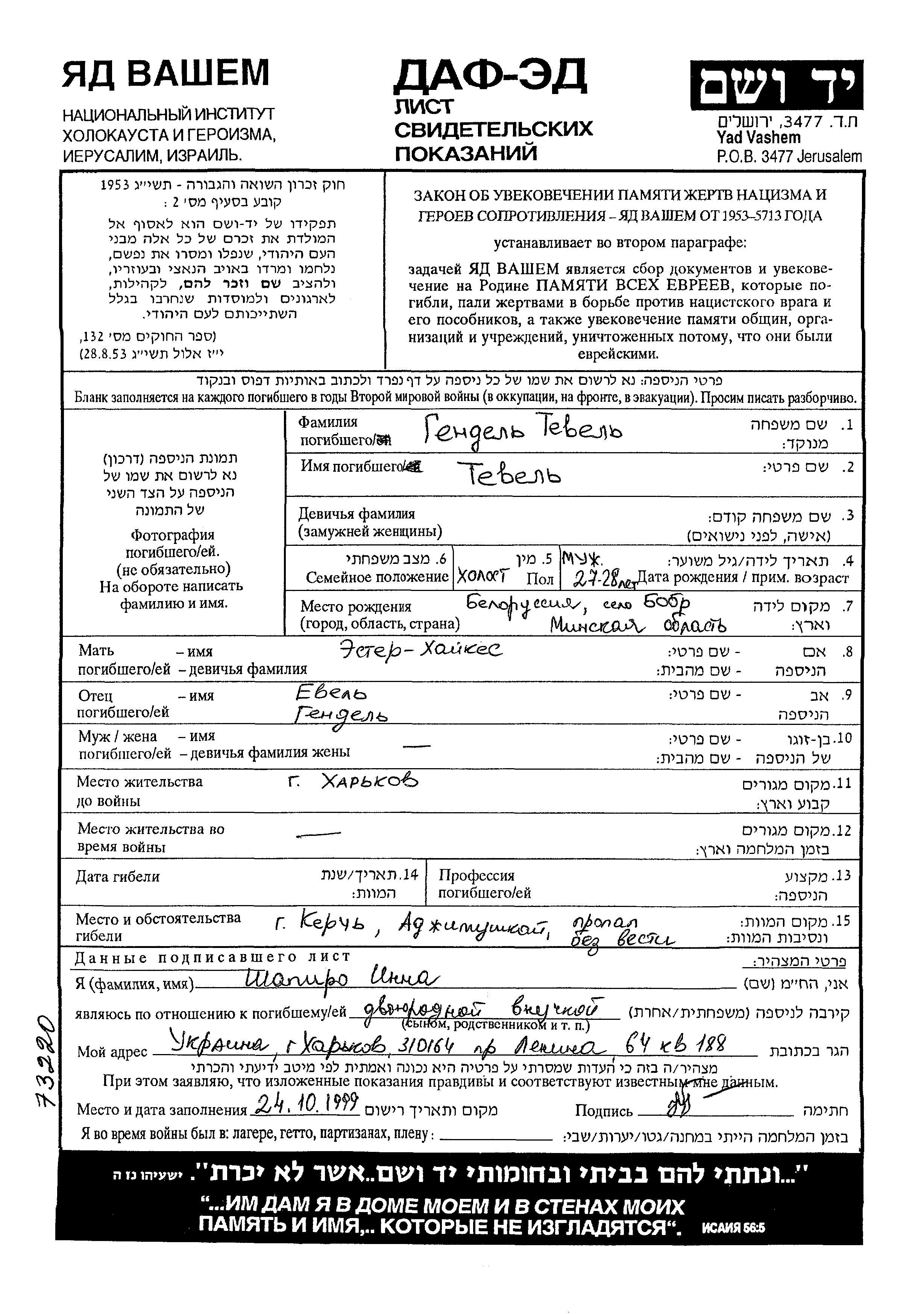 Gendel Tevye 1913 Kharkov, Ukraine (URSS) Feuille de témoignage