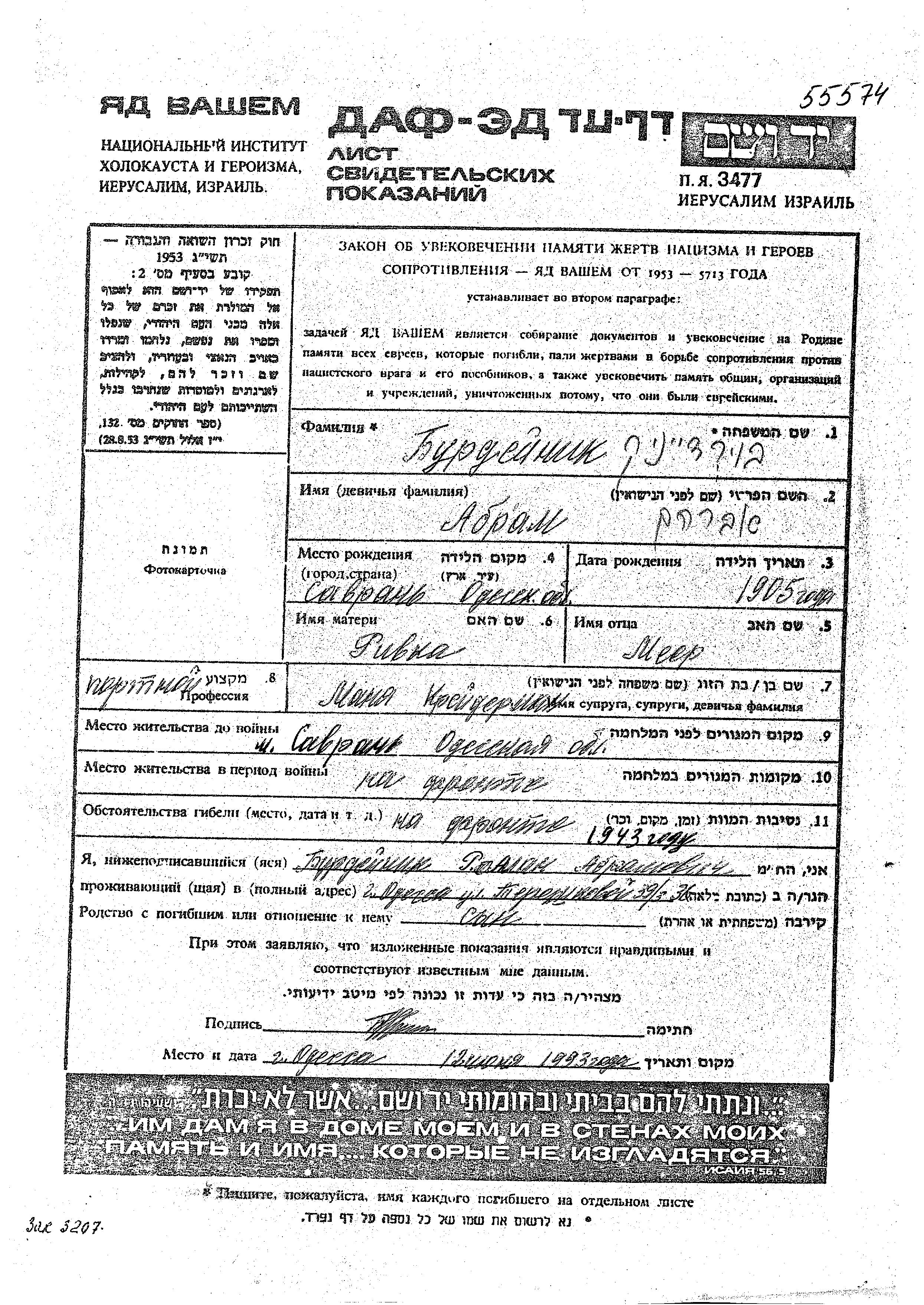 Burdeinik | Abram | 1905 | Savran, Ukraine (URSS) | Feuille de témoignage |