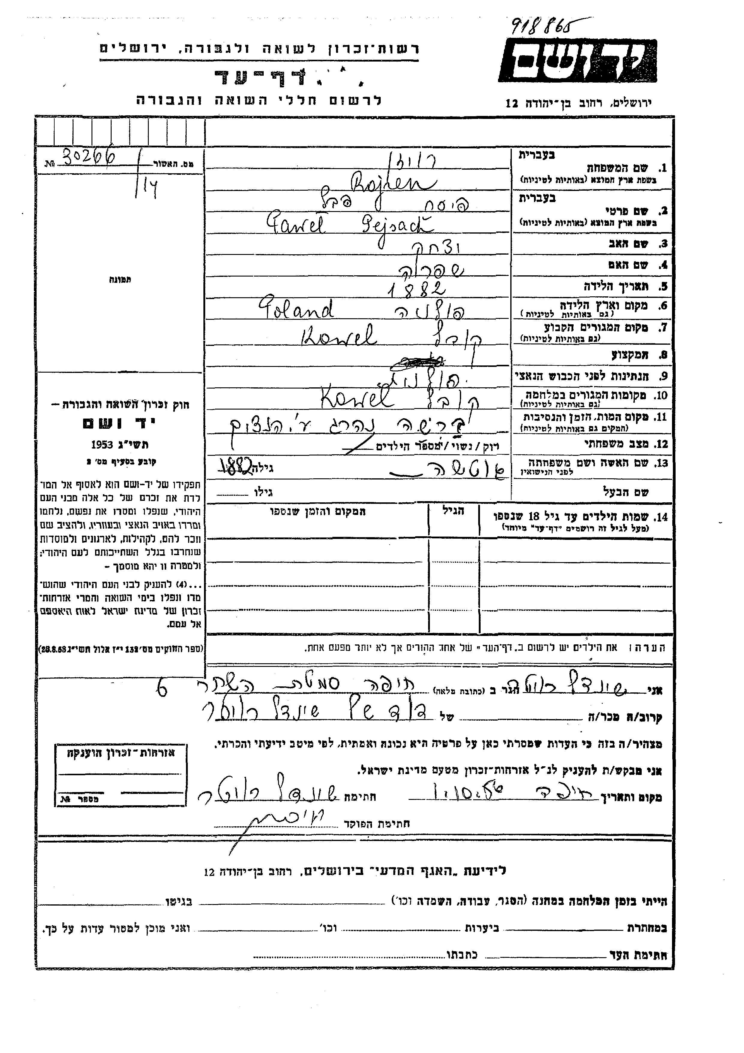 Pawel Pejsach Rojzen est né à Pologne en 1882, fils de Yitzkhak et de Shifra. Il était Mariée à Gucha. Avant la seconde guerre mondiale il vivait à Kowel, Pologne. Au cours de la guerre, il était à Kowel, Pologne.