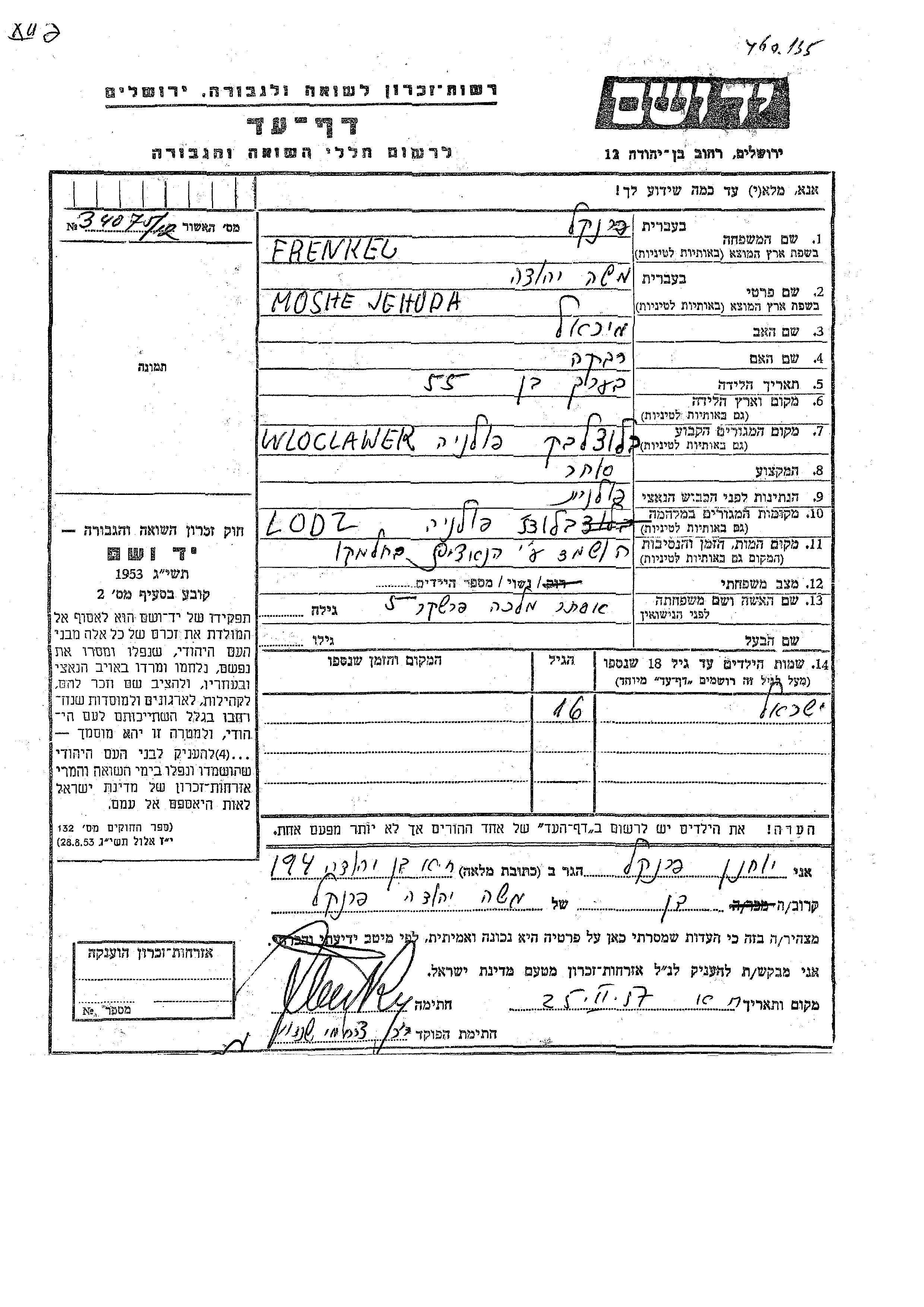 Frenkel | Jehoda Moshe | Wloclawek, Pologne | Feuille de témoignage | |