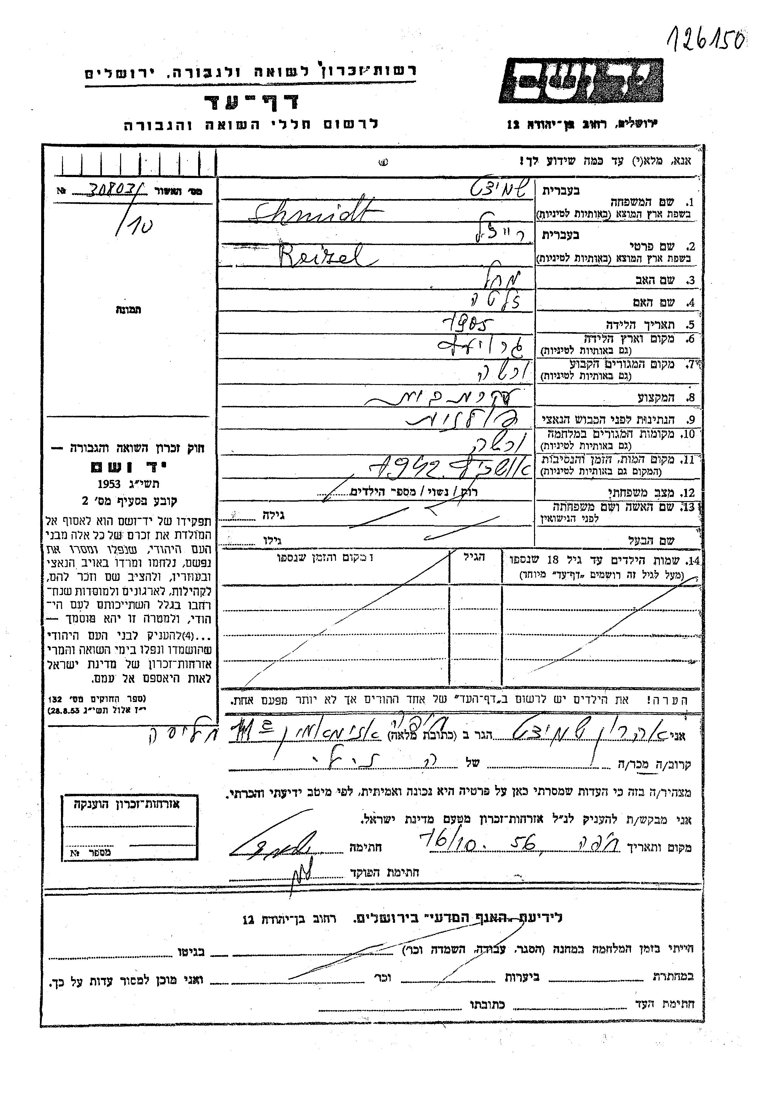 Shmidt Reizl 1905 Warszawa, Pologne Feuille de témoignage
